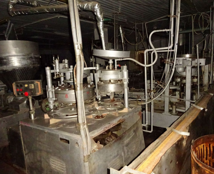 Автомат В2 ФНА фасует и дозирует мясо, жир и соль с перцем в жестяные банки № 3, 4, 8, 9, 12, 13, 43
