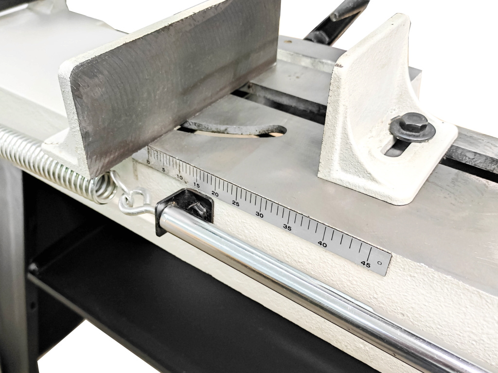 — В случае необходимости можно произвести распил заготовки под углом. Поворотная рама оборудования допускает поворот на 45 градусов;