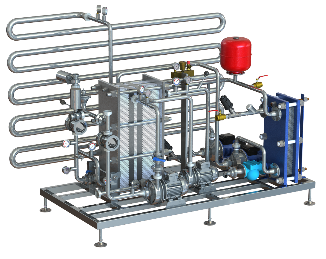 Пастеризационно-охладительная установка предназначена для мгновенного нагрева и последующего охлаждения пива в трёхсекционном противоточном пластинчатом теплообменнике. Данный процесс уничтожает неспороносные бактерии дрожжи и микроскопические грибы, что увеличивает время хранения готового продукта. В пастеризаторе в качестве нагревающей среды используется горячая вода. Для нагрева воды используется пар, который поступает в систему, состоящую из компактного пластинчатого меднопаянного теплообменника, оборудованного парорегулирующим клапаном и кондесатоотводчиком. По желанию заказчика пастеризатор может быть оборудован трубной обвязкой, баком и насосной частью для мойки пастеризатора химическим раствором, без подключения к системе CIP-мойки. Все детали, контактирующие с продуктом выполнены из высококачественной нержавеющей стали и обеспечивают высоконадёжную и долговечную эксплуатацию. Установка смонтирована на одной раме из нержавеющей стали с регулируемыми опорами, благодаря этому занимает минимальную площадь и легко выставляется по уровню. В трёхсекционном пластинчатом теплообменнике происходит энергосберегающий процесс, который позволяет экономить до 90% энергии требуемой для нагрева и охлаждения продукта. Это происходит за счёт использования секции рекуперации, т. е. горячий продукт (после выдерживателя) производит первичный нагрев поступающего в пастеризатор холодного продукта. Холодный же продукт используется для охлаждения горячего. За счёт этого происходит экономия на хладоносителе и паре. Теплообменник собирается из пластин с бесклеевым креплением резиновых уплотнений. Особый рельеф теплообменных пластин позволяет получать высокий коэффициент теплопередачи при невысоких потерях давления, что уменьшает расход энергии и моющих средств при мойке. Установка, все применяемые материалы и комплектующие сертифицированы. Все пастеризационно-охладительные установки укомплектованы автоматической CIP мойкой, контроллер Siemens S7-300 + Touch panel Siemens. Технические характеристики: Температура при входе в установку 1-4 оС; температура пастеризации - 65-80 оС; выдержка-30с; температура на выходе из установки 2-4 оС; Теплоносител первичный -пар, вторичный - гор вод. Давление пара -10 бар; расход пара-8-10 кг/ч; температура горячей воды-68-83 оС; расход горячей воды-83л/ч; хладоноситель-пропиленгликоль; температура хладоносителя - (-4) оС; расход хладоносителя- 420-1000л/ч; потребляемая мощность -1. 86 кВт; сжатый воздух-6 бар. Изготовим пастеризаторы для пива производительностью от 300 до 20000л/час.