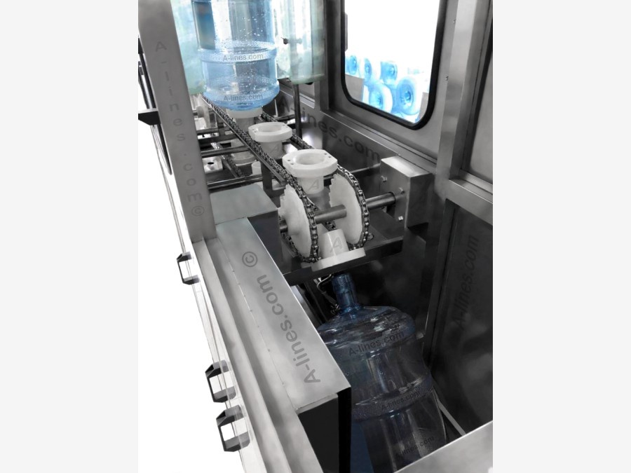 Розлив бутылок 19 л происходит одной разливочной головкой.