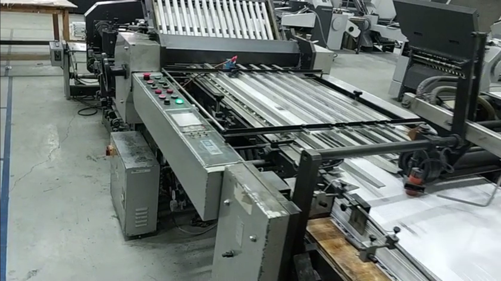 16-страничная комбинированная кассетно-ножевая фальцевальная машина с четырьмя фальцевальными кассетами, двумя электронными ножами в секции перпендикулярной фальцовки. Паллетная подача бумаги.
