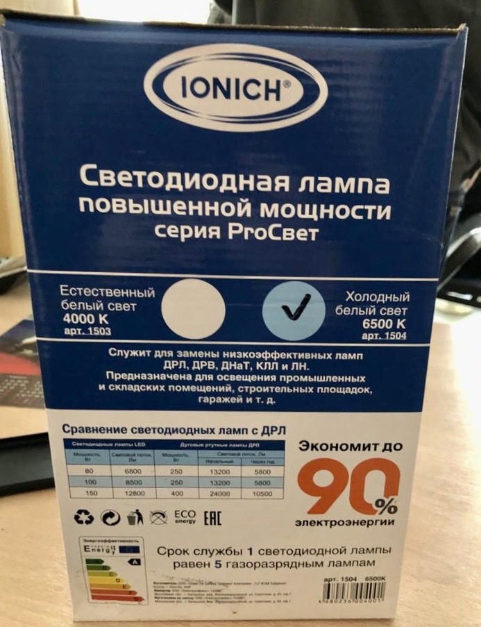 КОЭМЗ продает: Светодиодные лампы повышенной мощности серии РroСвет. Лампа светодиодная LED 150w 6500К, E40, 12800Лм, IONICH 1504. Служит для замены ламп ДРЛ, ДРВ, ДНаТ, КЛЛ и ЛН.