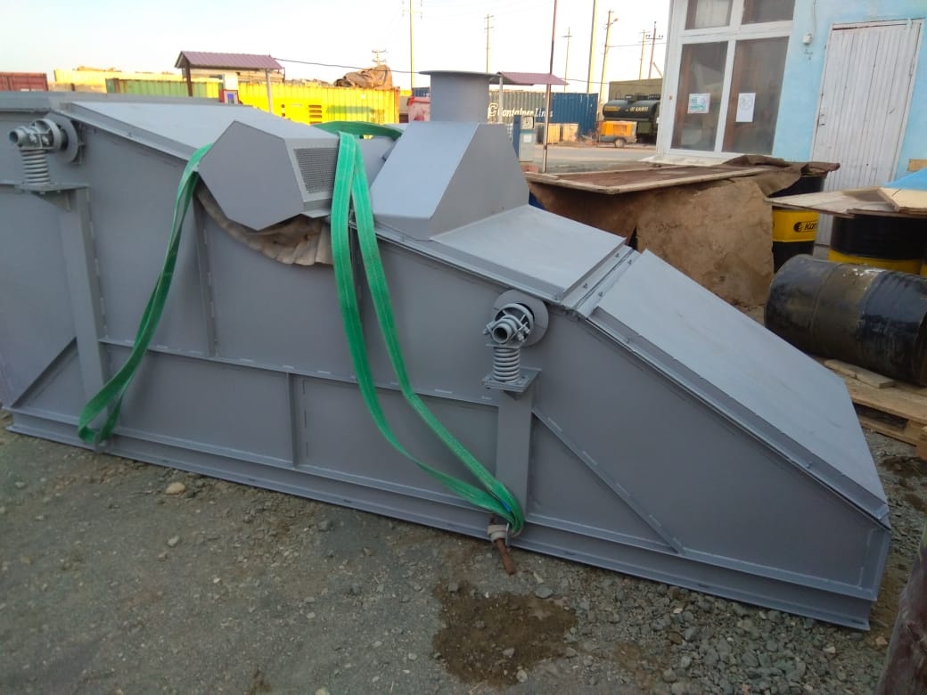Виброгрохот состоит из двух виброблоков, установленных над укрываемым коробом и включающих два однорядных роликоподшипника и симметрично по обе стороны расположенные дебалансы. Виброблоки соединены пружинным валом с резиновыми сочленениями. Привод вибраторов - через муфту с хомутами от неподвижно установленного электродвигателя. Грохот установлен на четырех витых пружинах. Технические характеристики грохота: