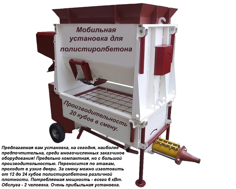 Мобильное оборудование для полистиролбетона купить у нас можно - без посредников! Мы сами его производим!МОБИЛЬНАЯ УСТАНОВКА «УМКА-0.2»Универсальный Малогабаритный Комплекс Автономный «УМКА» — 0.2 — это обоpудование для изготовления пенобетона полистиролбетона пeнoпoлиcтирoлбeтoна. Применяется для строительства промышленных объектов и частного сектора. - Возможна установка «УМКА 0.2» - на автомобильный прицеп категории «В». - Возможна комплектация нашими шлагами, для подачи смеси на 3 – 5 этаж. - Управление установкой осуществляется кнопками: «ПУСК» и « СТОП». - Возможно выполнить управление нашей установкой с ПДУ. - Покрытие металла установки Грунт-эмаль (три в одном). - Возможно покрытие металлических поверхностей установки, порошковой краской.Стоимость агрегата:под пенобетон — 320.000 руб.под полистиролбетон — 290.000 руб.1.Установка УМКА - 0,25 (0.5) предназначена, для приготовления полистиролбетона или пенобетона, и подачи к месту укладки смеси, при монолитной заливке: -полов; -стен; -кровли; -чердаков; -различных пустых замкнутых пространств; -междуэтажных перекрытий; -теплоизоляции промышленных холодильников; -теплоизоляции труб теплоснабжения;-теплоизоляции колодцевой кладки стен.2.Установка производит, стеновые строительные блоки, любых размеров (например: 200х300х 600 мм).3.Установка производит, межкомнатные стеновые перегородки, любых размеров (например: 100х300х 600 мм).Возможны варианты изготовления установки со смесителем объемом: 250 литров; 500 литров; 1000 литров.Технические характеристики установки. Установка состоит: из смесителя и героторного насоса.1.СМЕСИТЕЛЬ.- Питание - 380в / 3фазы (От сети 220 вольт- Не работает!)- Электрическая потребляемая мощность – 2.2 кВт- Объем смесителя по замесу - 250 литров. - Вес смесителя - 110 кг.- Производительность установки - 3 куб. м /час - Толщина металла – 3 мм - Покрытие металла «Грунт Эмаль» (три в одном). Возможно покрытие порошковым напылением. - Размеры смесителя (ДхШхВ) 1874х716х 900 мм2. ГЕРОТОРНЫЙ НАСОС.- Питание 380 вольт/ 3 фазы.- Электрическая потребляемая мощность насоса - 3 кВт.- Максимальное давление героторного насоса - 20 кг/см- Объем приемного бункера героторного насоса - 250 литров- Толщина металла – 3 мм - Покрытие металла «Грунт Эмаль» (три в одном). Возможно покрытие порошковым напылением. Напорная подача героторного насоса:- до 20 метров в высоту (в зависимости от вида продукта !)- до 50 метров в длину (в зависимости от вида продукта !)- вес насоса с приемным бункером объемом 250 литров - 140 кг- Размеры полностью собранного насоса (ДхШхВ) 1874х716х795 ммУстановку « УМКА - 0,2» применяют для приготовления и подачи следующих продуктов. • пенобетон• полистиролбетон• пенополистиролбетон• штукатурные смеси• полимеры• краски• лаки• смолы• грунтовки• клеи• мастики• масла• волокнообразующие• пастообразные• синтетические смолы• каучуковые смеси• резиновые смеси• смазки• инъекцирования растворов в полости• подача растворов в опалубку• огнезащитные,теплозащитные покрытия• незаменимы в технологии мокрого торкретирования• нанесение ремонтных,укрепляющих растворов• устройство стяжек• финишное выравнивание поверхностей• наливные полы• набрызга на стены• красители и кожевенные составы• шламы• сточные воды• переработанные воды• отстой• моющие средства• шампуни и жидкие мыла• густые пасты• сгущенный 