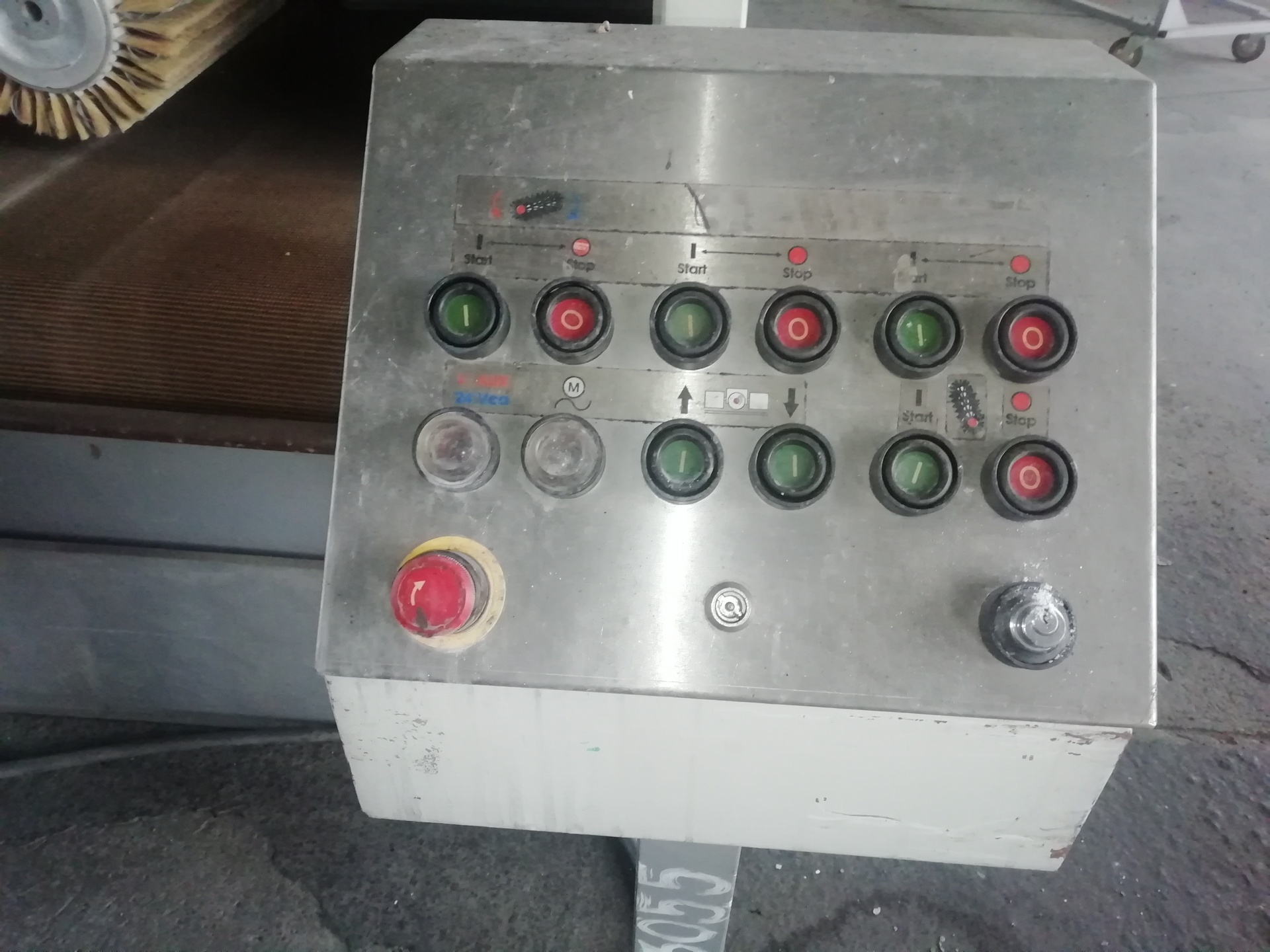 Ширина конвейера 1400 мм. Взаимозаменяемые шлифовальные инструменты могут монтироваться на съёмные шпиндели.. Переменная регулируемая скорость вращения шпинделей 300-1200 об/мин. Для привода поворота головки используется мотор с регулируемой скоростью 2 – 20 об/мин мощностью 1,5 кВт. Электрическая регулировка высоты прохода. Цифровой дисплей для контроля скорости ремня, скорости вращения шпинделей, карусели и головки.