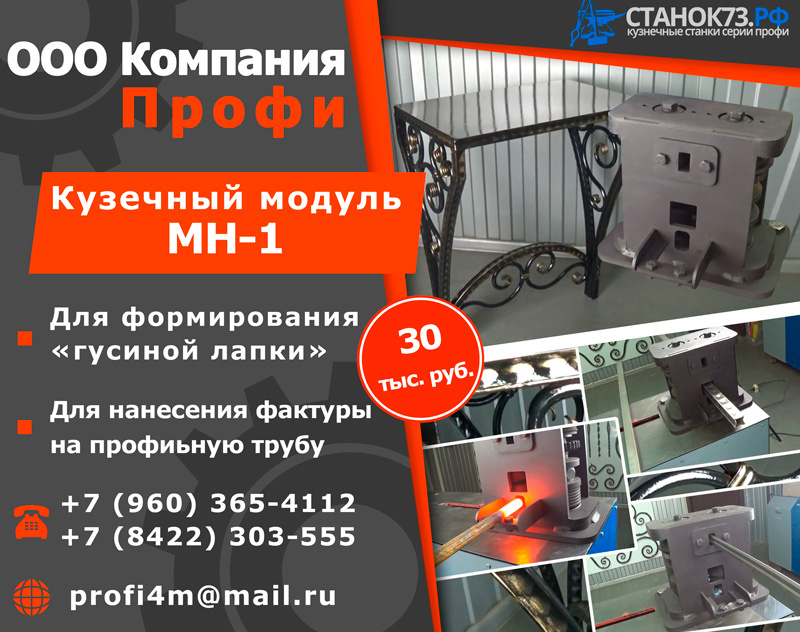 · Артикул МН-1. Модуль навесной, для раскатки «на горячую», окончаний «гусиная лапа», нанесения фактуры «ромбовидный узор» на профильную трубу и проката «хомутная полоса», цена 38000 рублей.