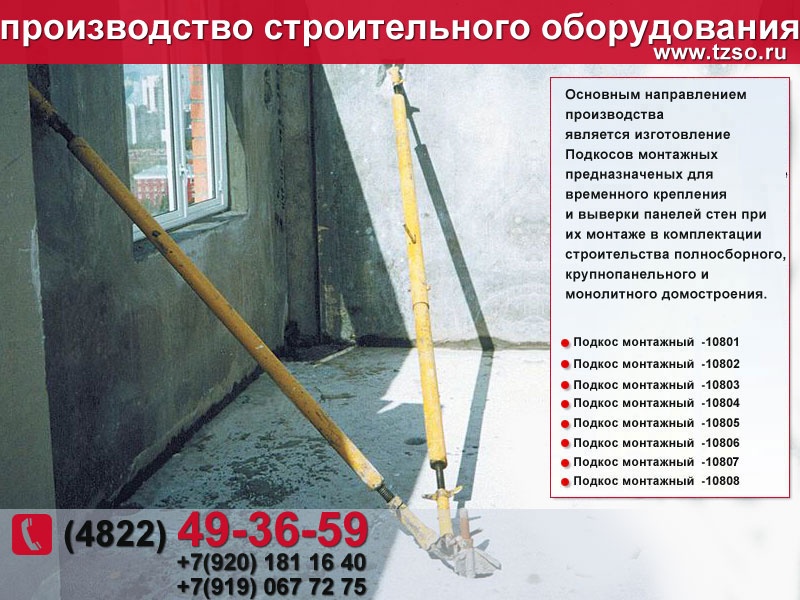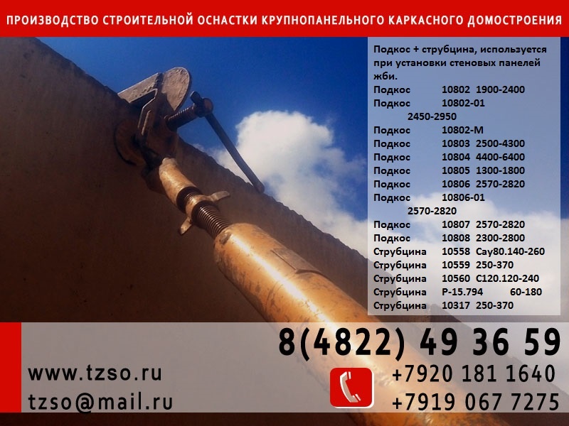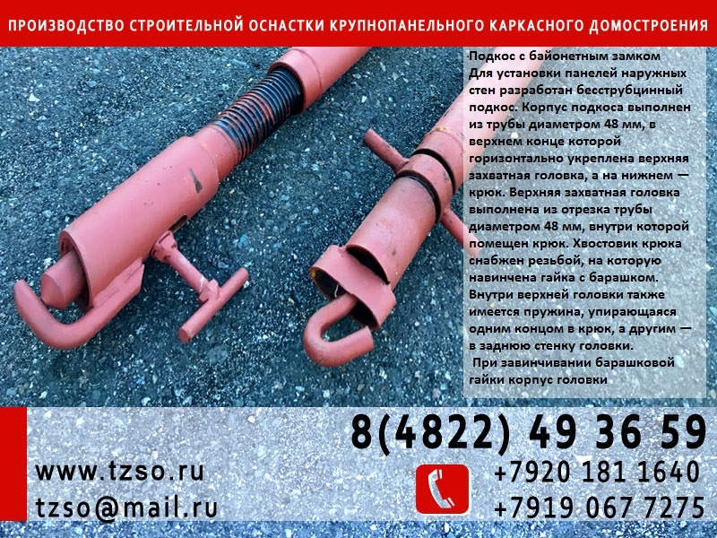 Монтажный подкос или крюк-крюк– это жесткая конструкция без собственных свойств устойчивости. Действует на линейное сжатие и используется для фиксирования элементов в установленной позиции. Это универсальное и распространенное приспособления для крепления невысоких колонн, элементов перегородки, панелей и прочих сборочных компонентов до финального проектного монтажа.Также применяется в каркасно-монолитных постройках.Несущие элементы производятся в соответствии с нормативами ГОСТ для соблюдения коэффициента стойкости.