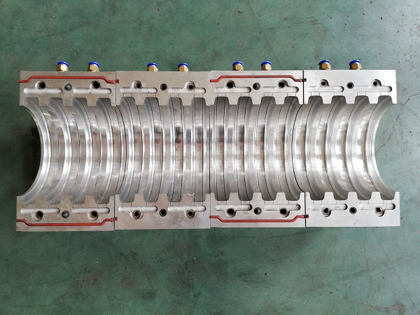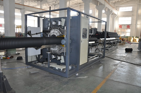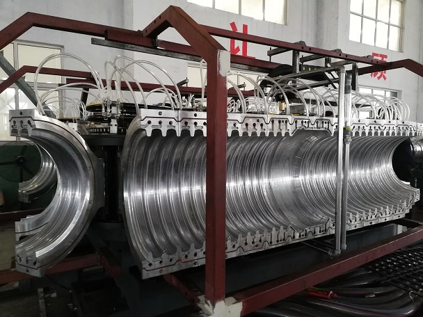 Производство гофрированных полимерных труб осуществляется следующим образом: неостывшая заготовка трубы подается в рабочую зону, к полуформам, которые примыкают одна к другой. Сжатый воздух обеспечивает фиксацию заготовки к охлажденной поверхности, благодаря чему труба твердеет, приобретая заданную форму. Свободно перемещающаяся внутри рукава пробка, которая крепится к дорну, поддерживает нужный уровень давления.