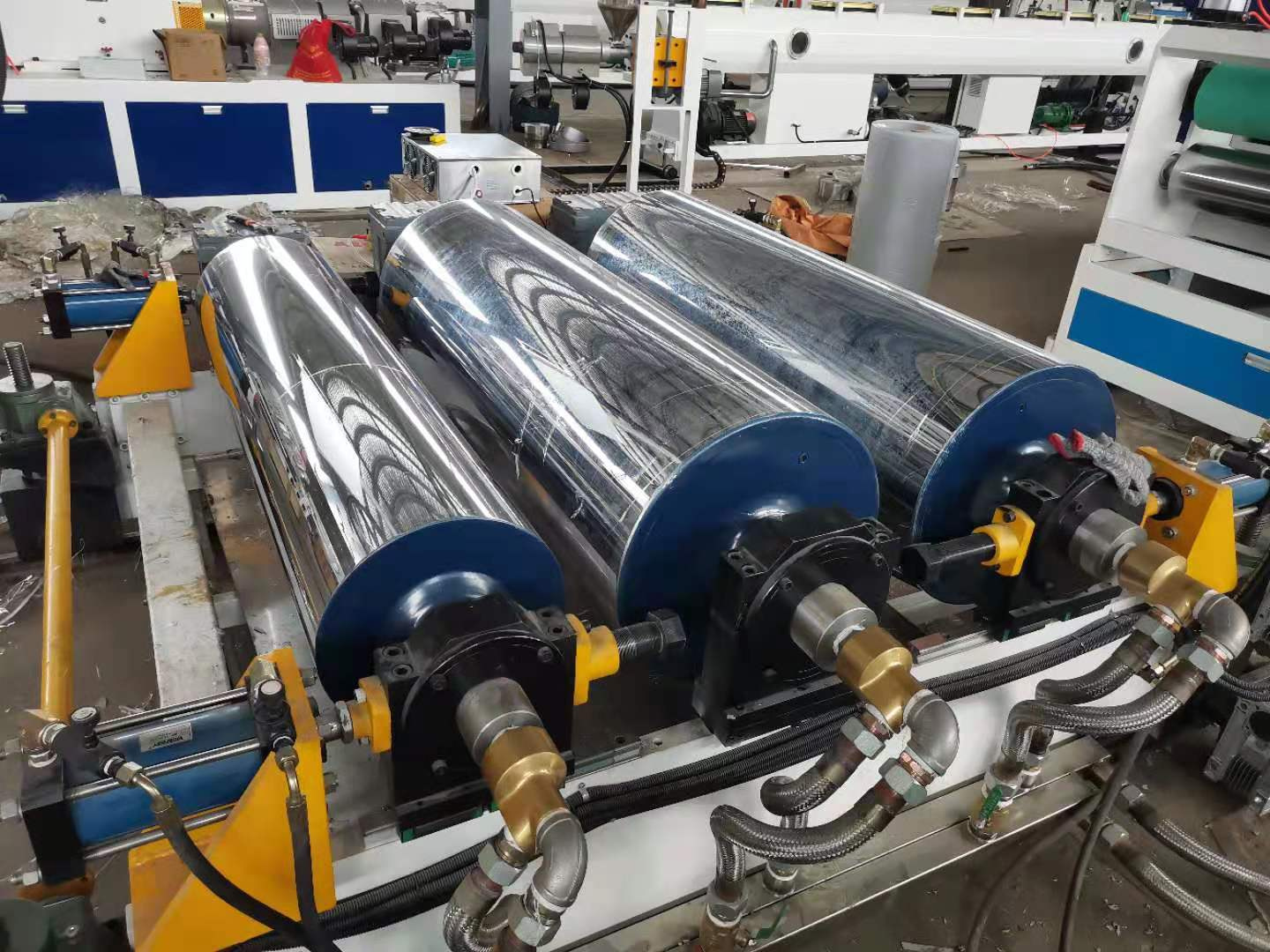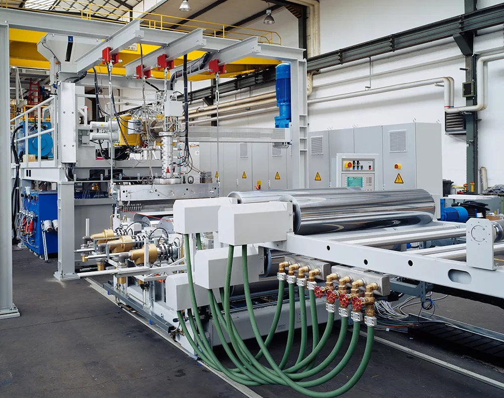 Линии включают: экструдер с коническими шнеками для основного слоя и, плоскощелевую головку, калибратор, устройство охлаждения, тянуще-формовочное устройство, отрезное устройство, накопитель.