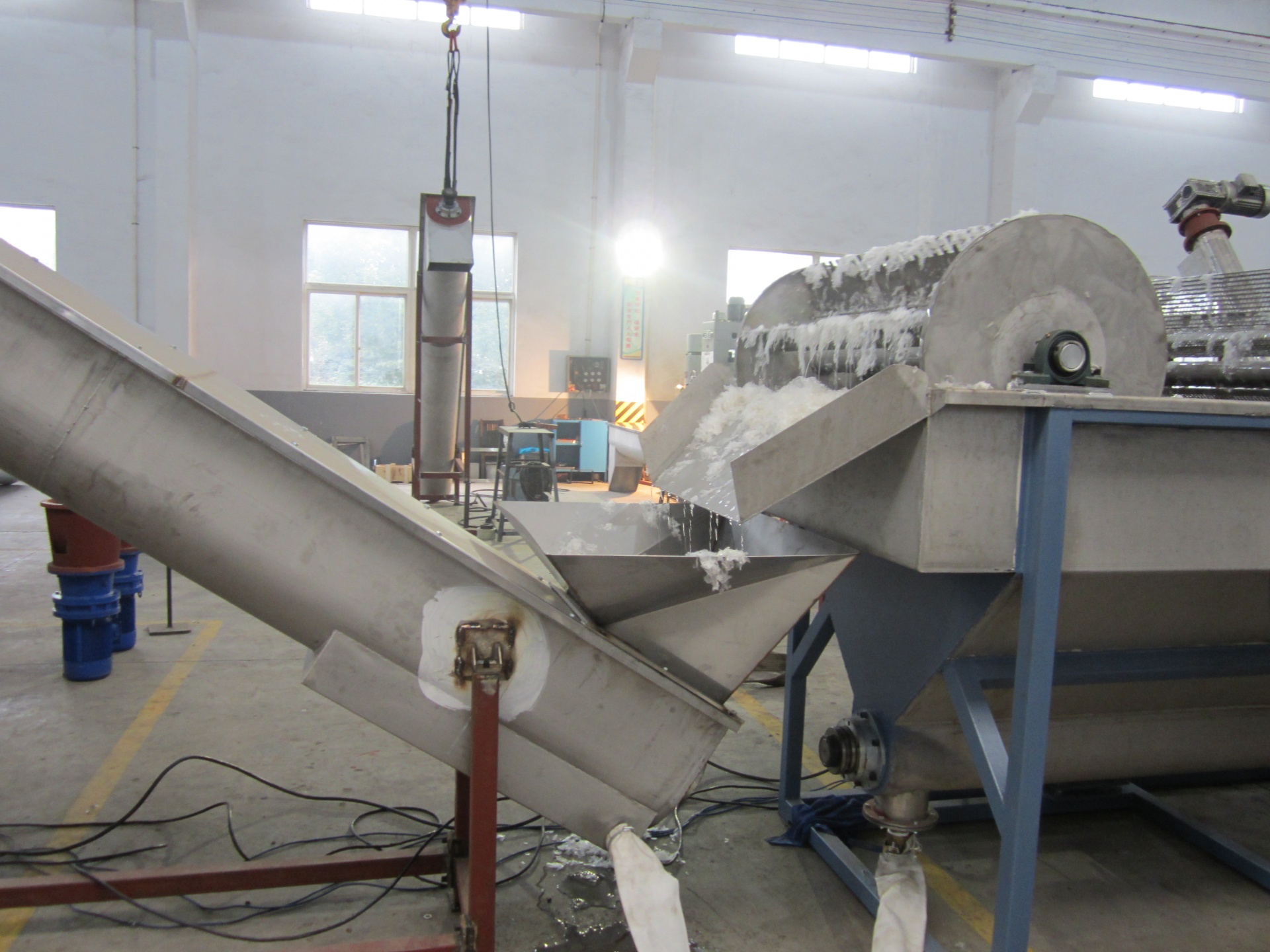 Производительность линии — 300 кг/ч. Потребление энергии 136 кВт/ч (установленное), 100 кВт/ч реальное. Воды в системе 3^м. Частота замены воды зависит от типа и количества загрязнения.