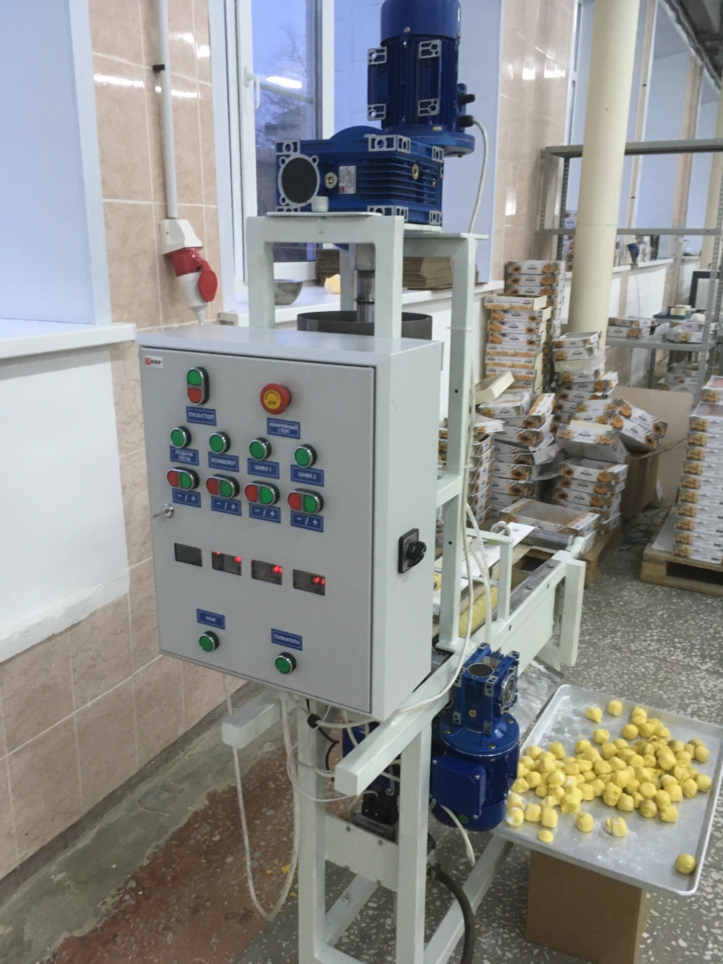 тесто загружается в приемный бункер, далее нагнетающим шнеком экструдируется через формующую трубку, затем перемещается по ленточному конвейеру в матрицу формирования округлой формы.