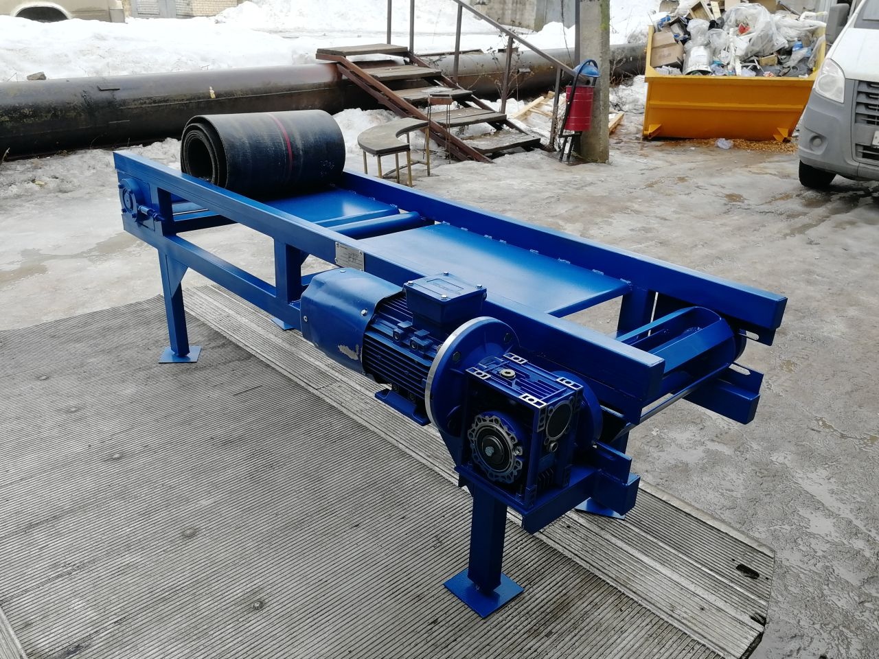 Дополнительно может быть укомплектован опорными стойками, кнопочным постом, приёмной и выгрузной горловинами и частотным преобразователем для регулировки скорости перемещения.