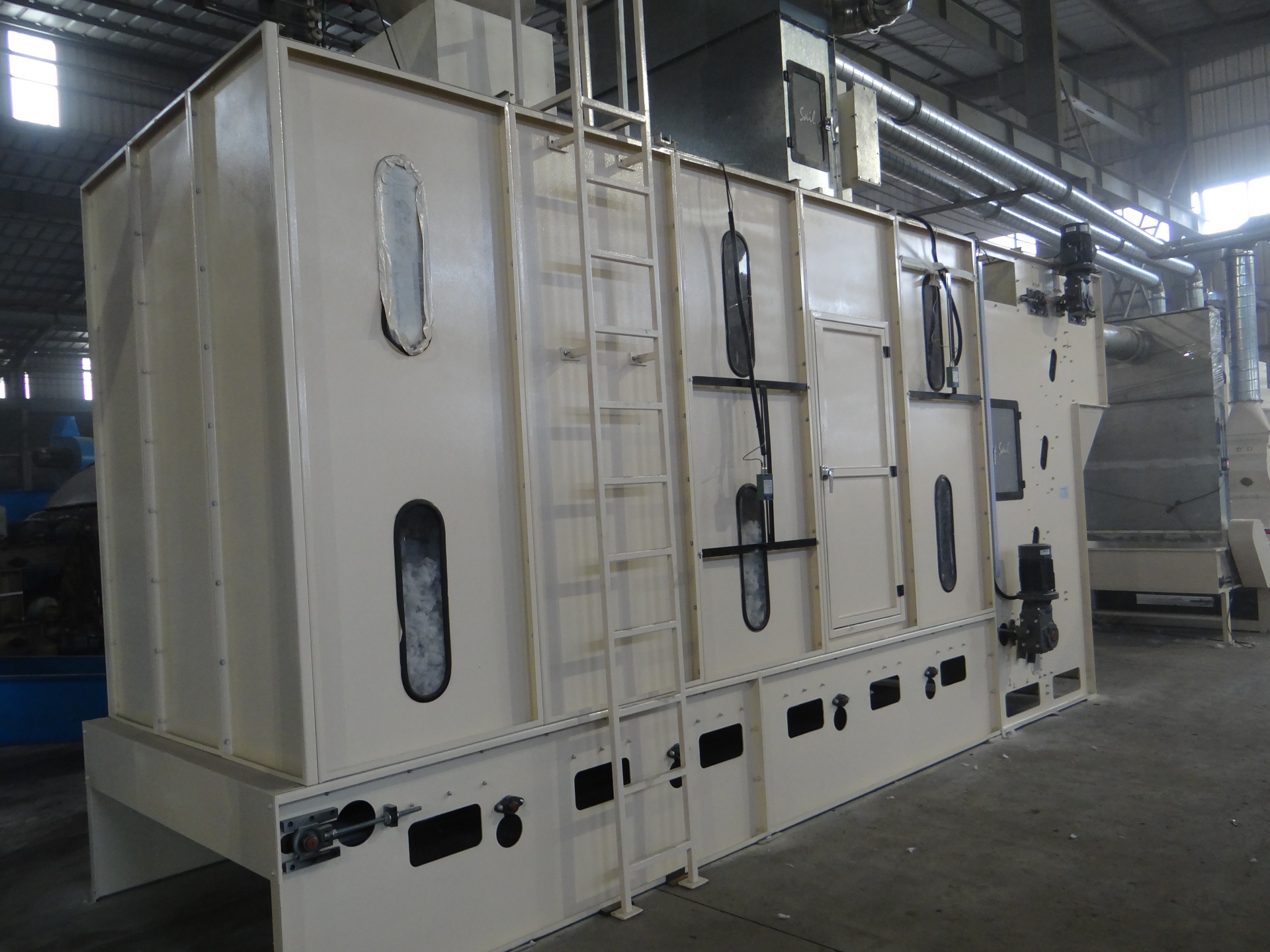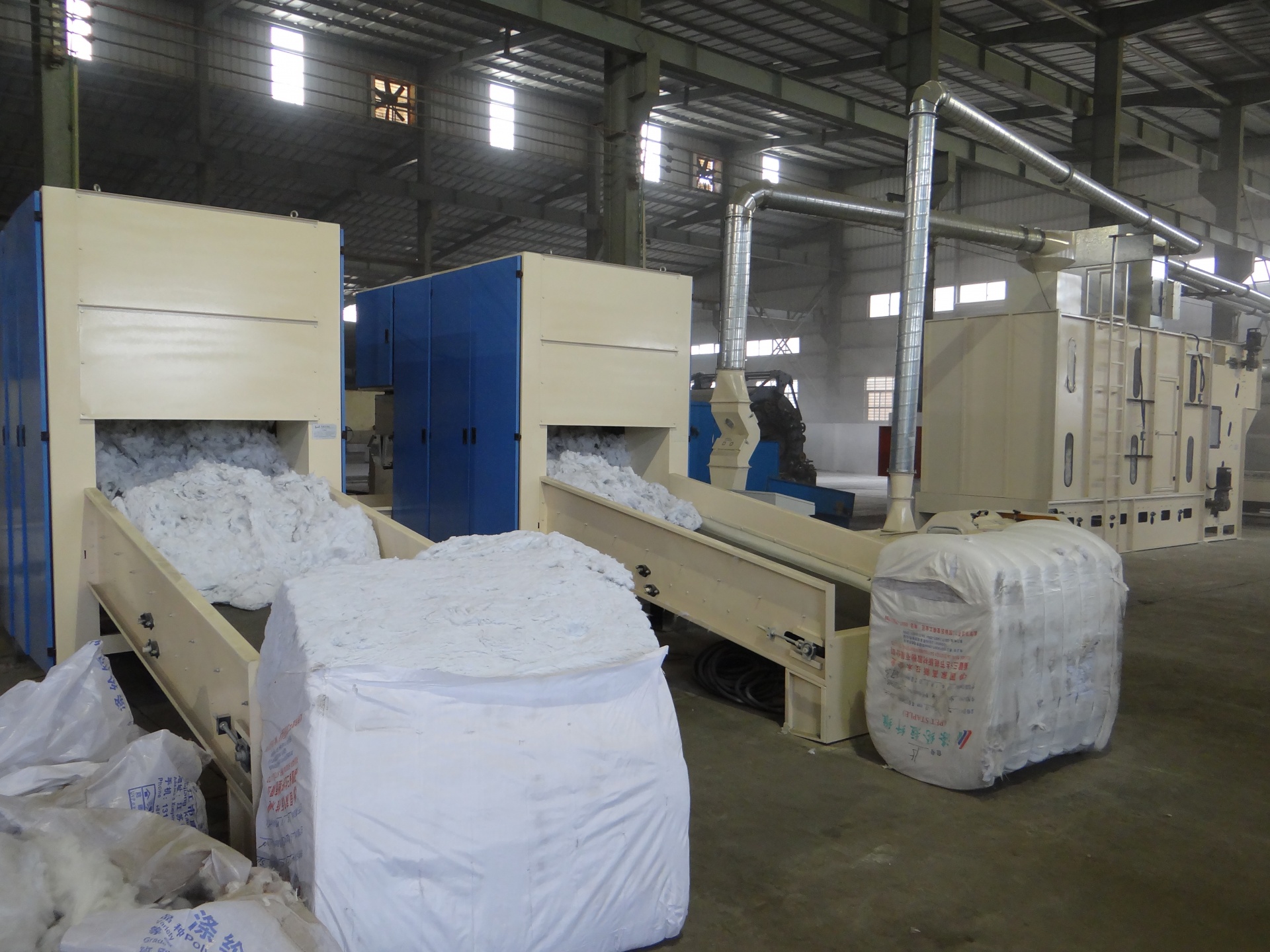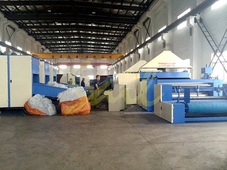 Использует кипоразрыхлитель для непрерывной подачи волокнистых сырей в производственную линию, в то же время распределяются разные виды сырья. Используется пред-разрыхлитель и главный разрыхлитель для разрыхления волокна, с помощью вибрационный питатель оформляет волокнистое полотно и подает волокнистое полотно в чесальную машину для чесания, после чесание использует раскладчик расставлять полотно до указанной толщины или плотности, подает волокнистое полотно в печку, использует разные типы печки производить разные виды синтепона, потом с помощью каландра обработает поверхность синтепона. Готовый синтепон входит в намотчик для намотки и упаковки и получает окончательную продукцию.
