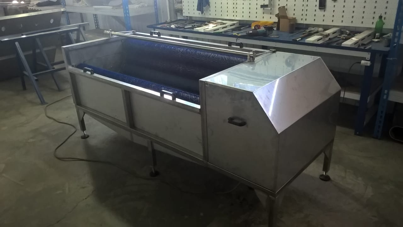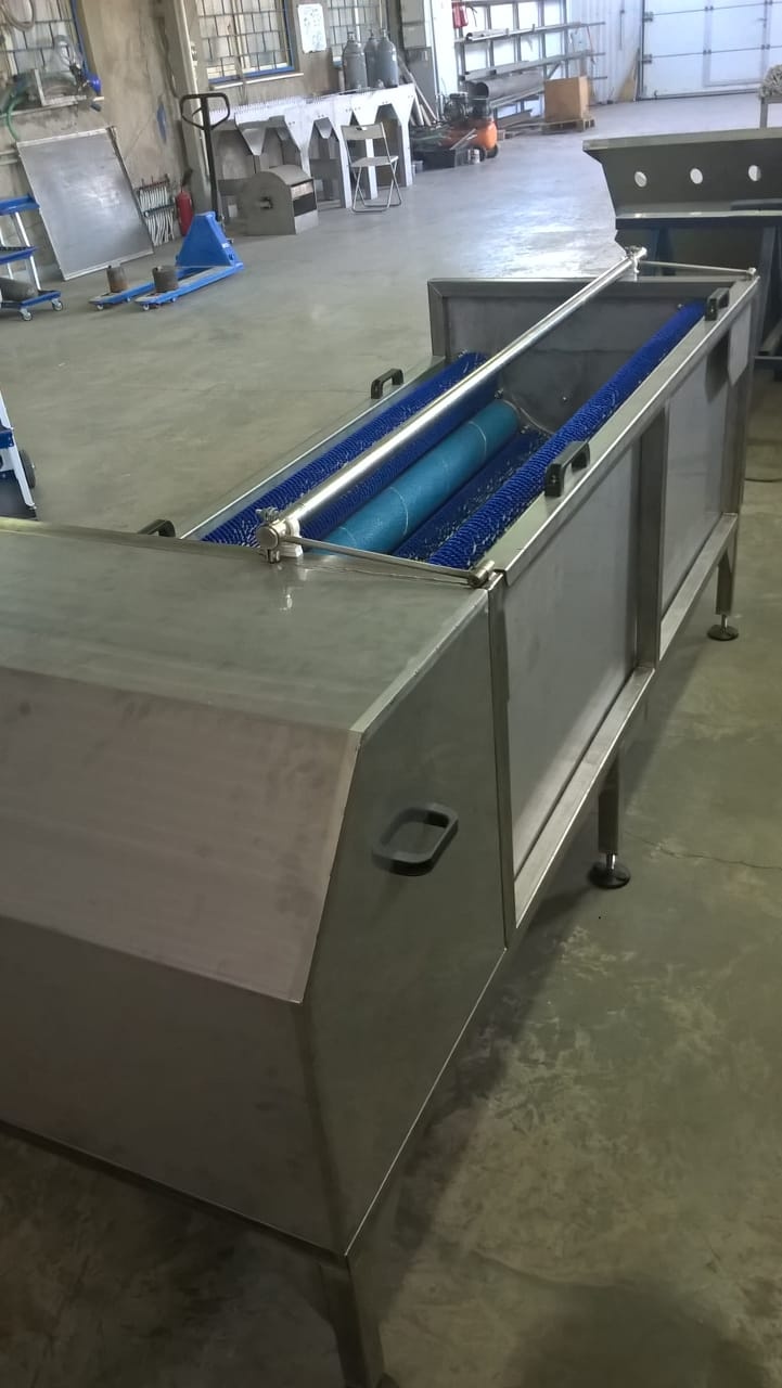 Продукт засыпается в машину на валы. В процессе вращения продукт очищается и ополаскивается душирующим устройством. Грязная вода, стекает в нижний поддон, из которого отводится во внутрицеховую канализацию.