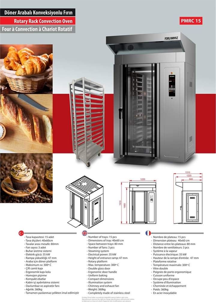 циклотермическая печь с каменным подом, электрическая ярусная печь, конвекционная печь, конвейерная электрическая печь для лаваша, конвейерная печь для пиццы, тестоделитель, тестоокруглитель, шкаф предварительной расстойки, тестозакаточная машина, багетоформующая машина, гидравлический тестоделитель (квадратное разделение), тестоделитель-округлитель, спиральный тестомеситель со стационарной дежой, спиральный тестомеситель с откатной дежой, тестомеситель, планетарный миксер, автоматический планетарный миксер, тестораскаточная машина, настольная тестораскатка, автоматическая хлеборезка с раздувателем пакетов, горизонтальная