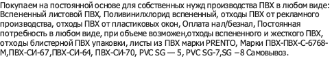 Покупаем на постоянной основе для собственных нужд производства ПВХ в любом виде: Вспененный листовой ПВХ, Поливинилхлорид вспененный, отходы ПВХ от рекламного производства, отходы ПВХ от пластиковых окон, Оплата нал/безнал, Постоянная потребность в любом виде, при объеме возможен,отходы вспененного и жесткого ПВХ, отходы блистерной ПВХ упаковки, листы из ПВХ марки PRENTO, Марки ПВХ-ПВХ-С-6768-М,ПВХ-СИ-67,ПВХ-СИ-64, ПВХ-СИ-70, PVC SG — 5, PVC SG-7,SG −8 Самовывоз.