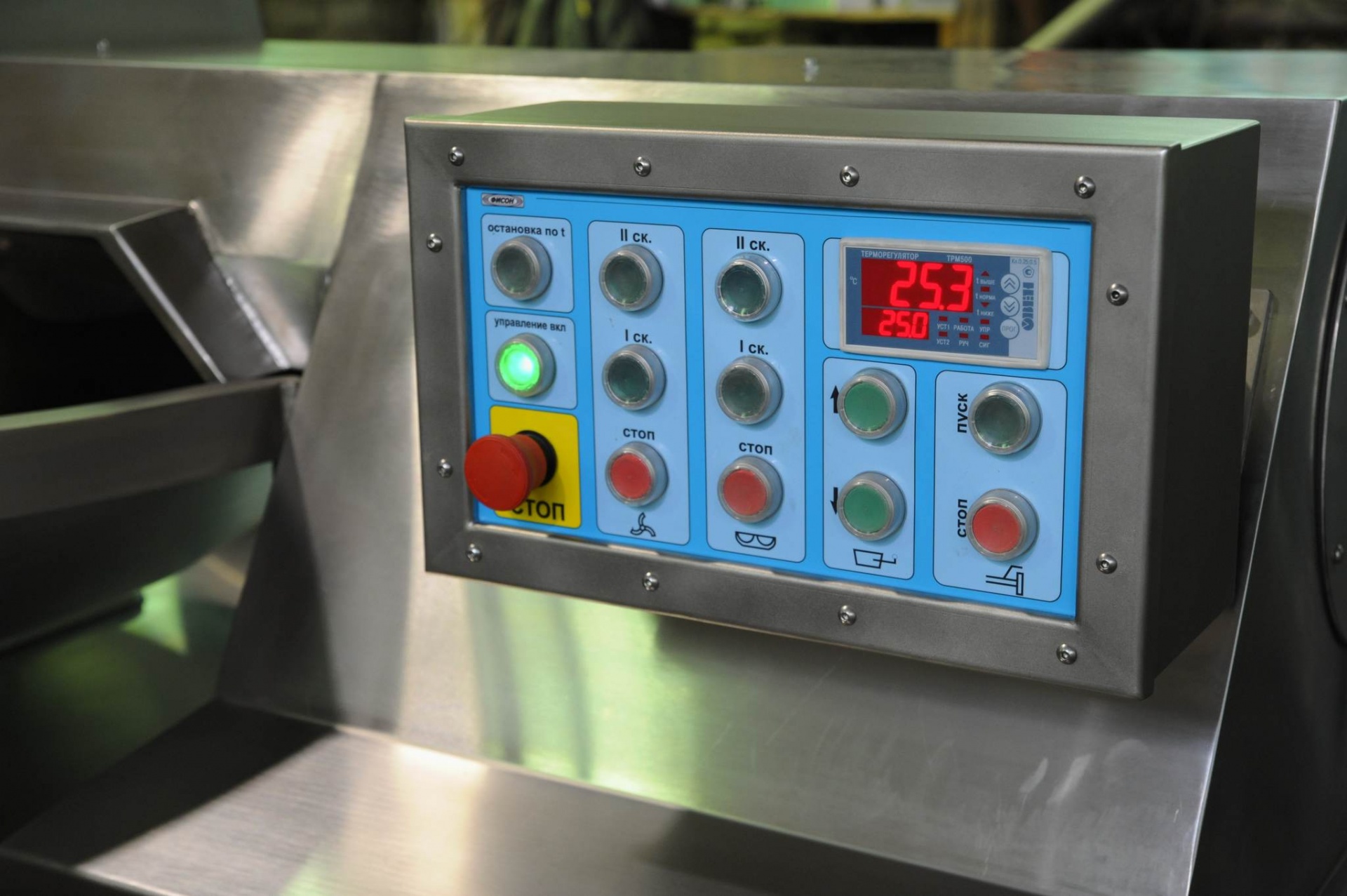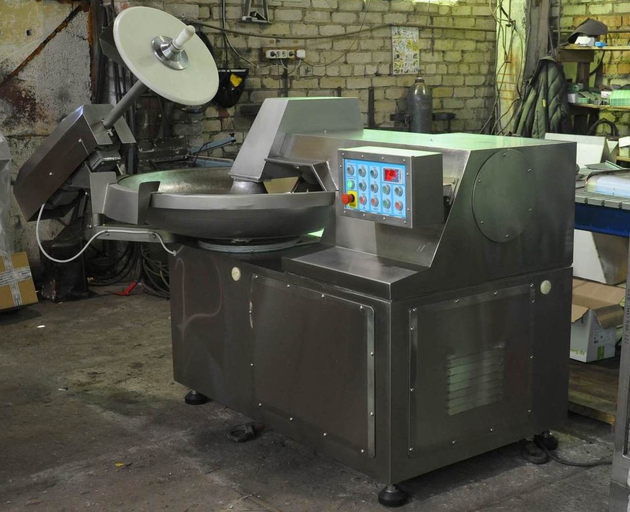 Имеется цифровой измеритель температуры фарша с возможностью остановки процесса куттерования по достижении заданной оператором температуры.