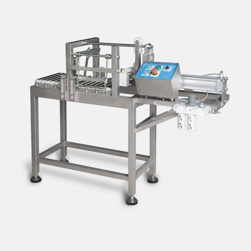 Разрезаемый брусок сыра устанавливается на роликовый транспортер к регулируемому упору и поджимается вторым опускаемым упором. После нажатия кнопки «<-» толкатель подает брусок продукта на рамку с ножами, где и происходит его разрезание в вертикальном направлении на куски, размер которых зависит от расстояния между ножами. По достижении крайнего переднего положения толкателя произойдет автоматический возврат толкателя в исходное положение и машина остановится. Предусмотрен полуавтоматический режим, в котором толкатель приходит в движение сразу после опускания второго упора без нажатия кнопки и останавливается так же после возврата в исходное положение. Загрузка и выгрузка вручную. Возможна установка дополнительных столиков и бортов.