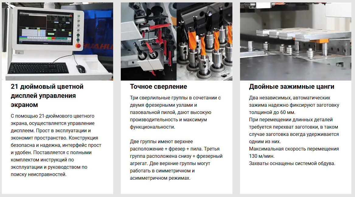 Станок предназначен для высокоскоростного и точного, глухого и сквозного сверления плоскостей и торцов мебельных деталей, с возможностью фрезерования паза, выборки, снятия четверти двумя присадочными головами, верхней и нижней плоскостей торцов мебельных деталей. Центр обеспечивает сверление всех карт присадки за один проход детали.