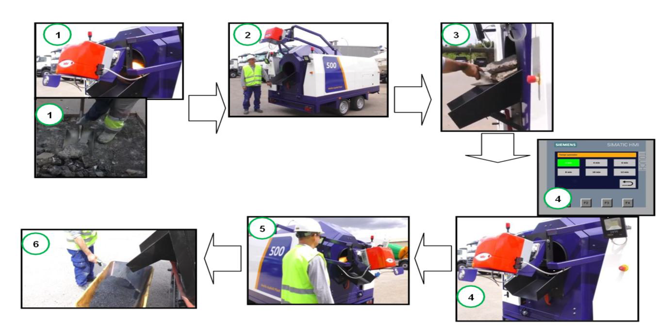 3. Затем загружается асфальт для повторного использования в барабан (максимальная загрузка 500 кг).