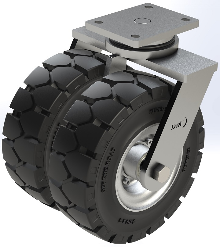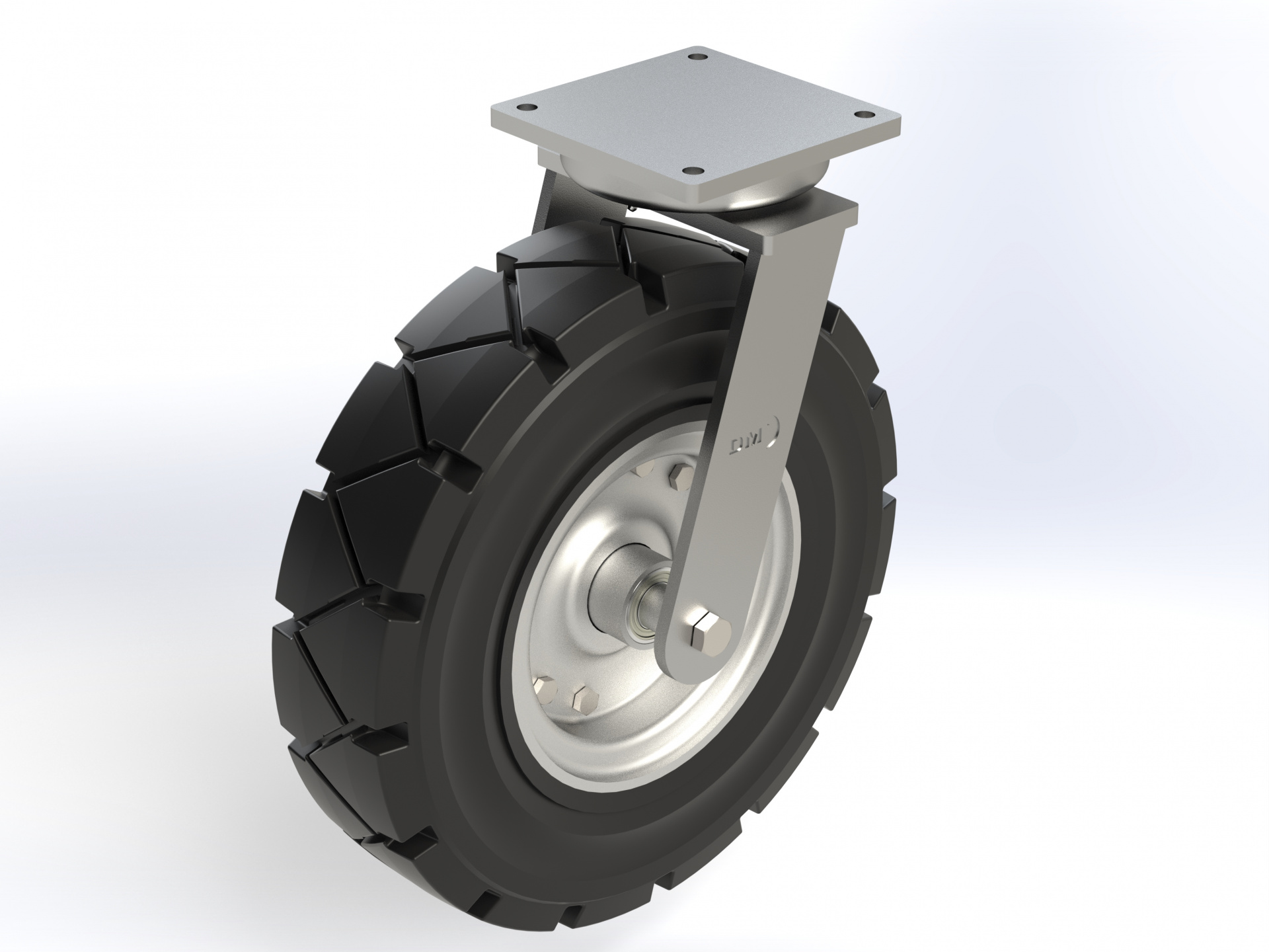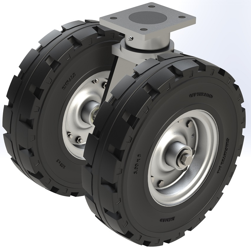 Предлагаем большегрузные колесные опоры с особо прочными сварными кронштейнами. Поворотный узел на двойном упорном подшипнике со смазочными ниппелем. Колесный диск сборный с вваренной ступицей и сдвоенными шарикоподшипниками. Шина цельно-резиновая (суперэластик) диаметром 400 мм / шириной 105 мм. Грузоподъемность до 2000 кг.