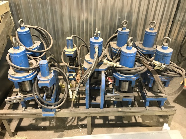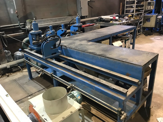 В комплекте со станоком идут 15 пробивных станций. Восемь станций выполняют вырубку углов под кассеты открытого и закрытого типа. Одна станция вырубает угол для изготовления Угловых кассет и П - образных. Шесть станций вырубают дополнительные отверстие по усмотрению. Привод гидравлический - одновременно просекаются два угла и отверстия на перпендикулярных кромках заготовки за один рабочий цикл - просечки приводятся в действие с помощью педали - упоры устанавливаются вручную - рабочая поверхность стола оборудована шаровыми опорами - потребляемая мощность 4 кВт -вес 950 кг.