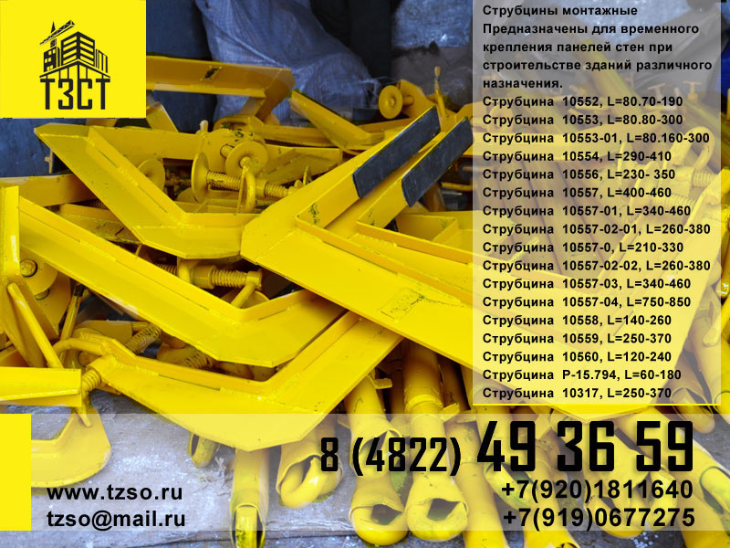 Отправка в любой регион РФ. Собственное производство. Производим подкосы и обоймы для монтажа ЖБ колонн любых размеров. Широкий ассортимент строительного и грузоподъемного оборудования (обоймы ЖБИ, подкосы ЖБИ, подкосы ПМТ, струбцины монтажные, кондуктор для монтажа колонн, траверса для монтажа колонн, захват для колонн, захват для лестничных маршей в комплекте со стропами и пр.). Более подробную информацию уточняйте у наших специалистов.