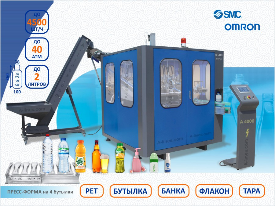 Производительность автомата выдува пэт бутылок, банок - до 4500 бутылок в час,
