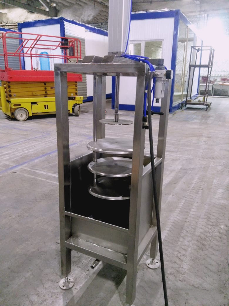 Пресс состоит из основания сварной конструкции, вертикальных цилиндрических стоек, прессующих нержавеющих полок, пневмосистемы пневмоцилиндров. Формы с сырной массой крепятся на полках. Подъемы и опускания прессующих полок осуществляются путем подачи сжатого воздуха в полости пневмоцилиндров.