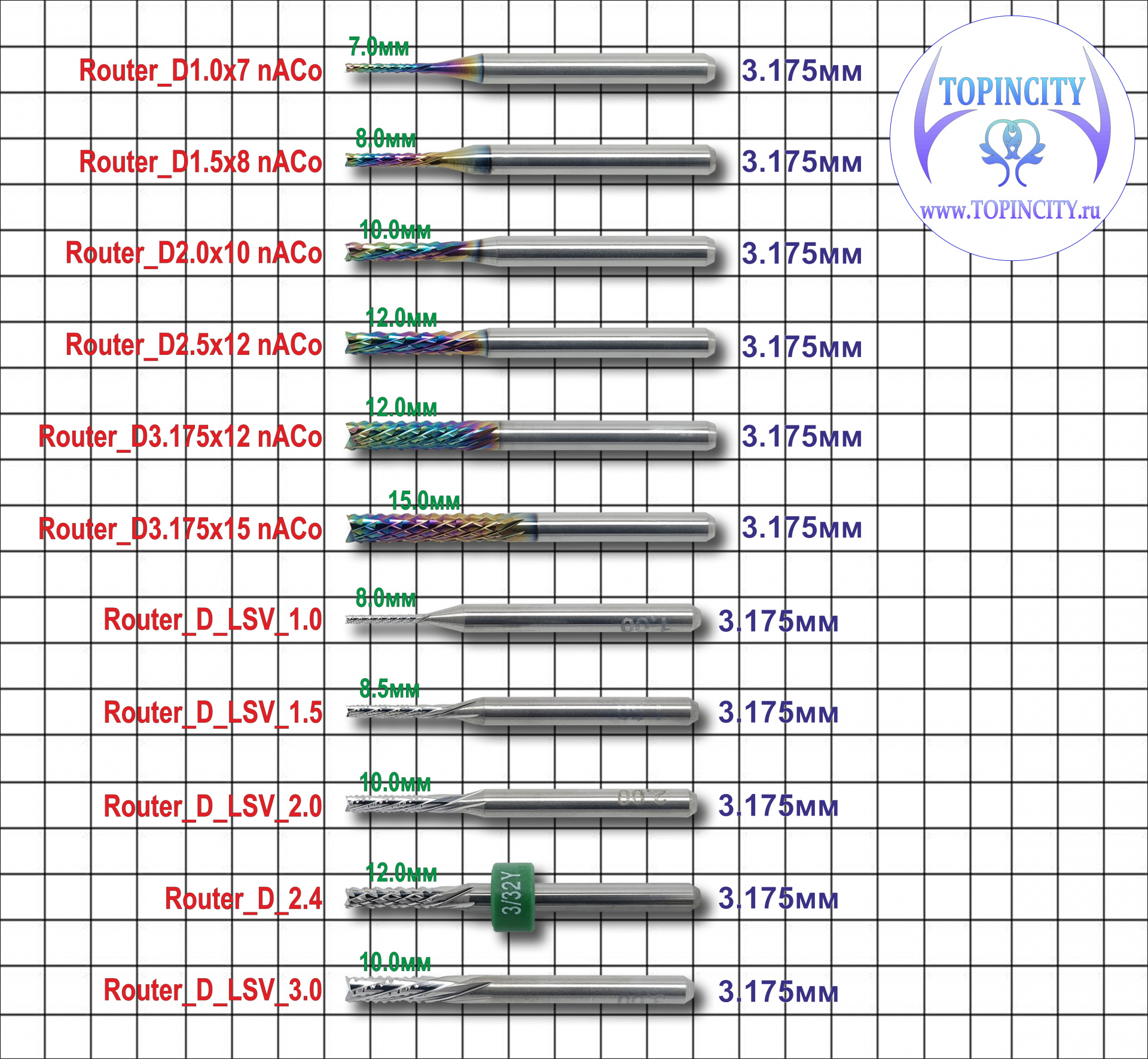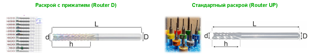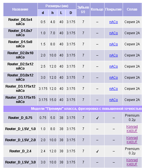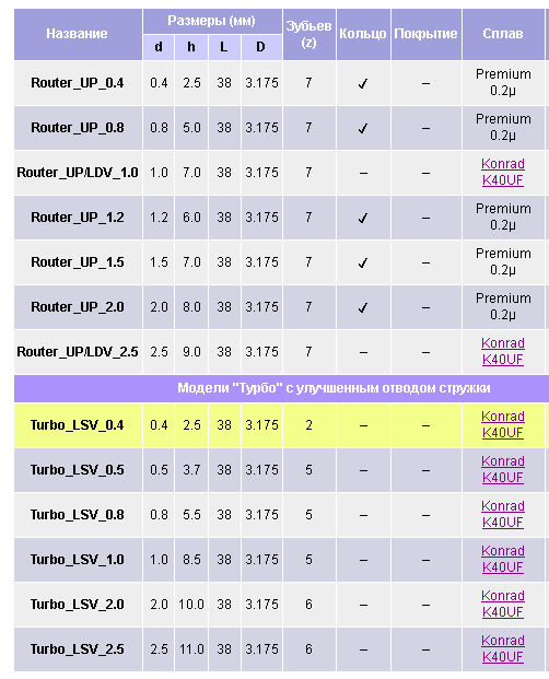 Назначение2 (кукуруза): Фреза для радиального раскроя. Заточка фрезы напоминает тип заточки фрез #Router UP, но больше похожа на рашпильную заточку боров. Такой тип заточки позволяет выбрасывать стружку в бок. Данную заточку использует основная масса китайских производителей. Фреза работает по типу наждака, который забуривается в заготовку, этим сохраняя структуру слоёв заготовки не срывая волокон. Хорошо проходит дуги, радиусы и углы. Лучше всего подходит для вырезания изделий, пазов, различных форм, резки гетинакса, композитов, G10, FR4, микарта, текстолита, различных металлов, , углепластиков, стеклопластиков и дерева.