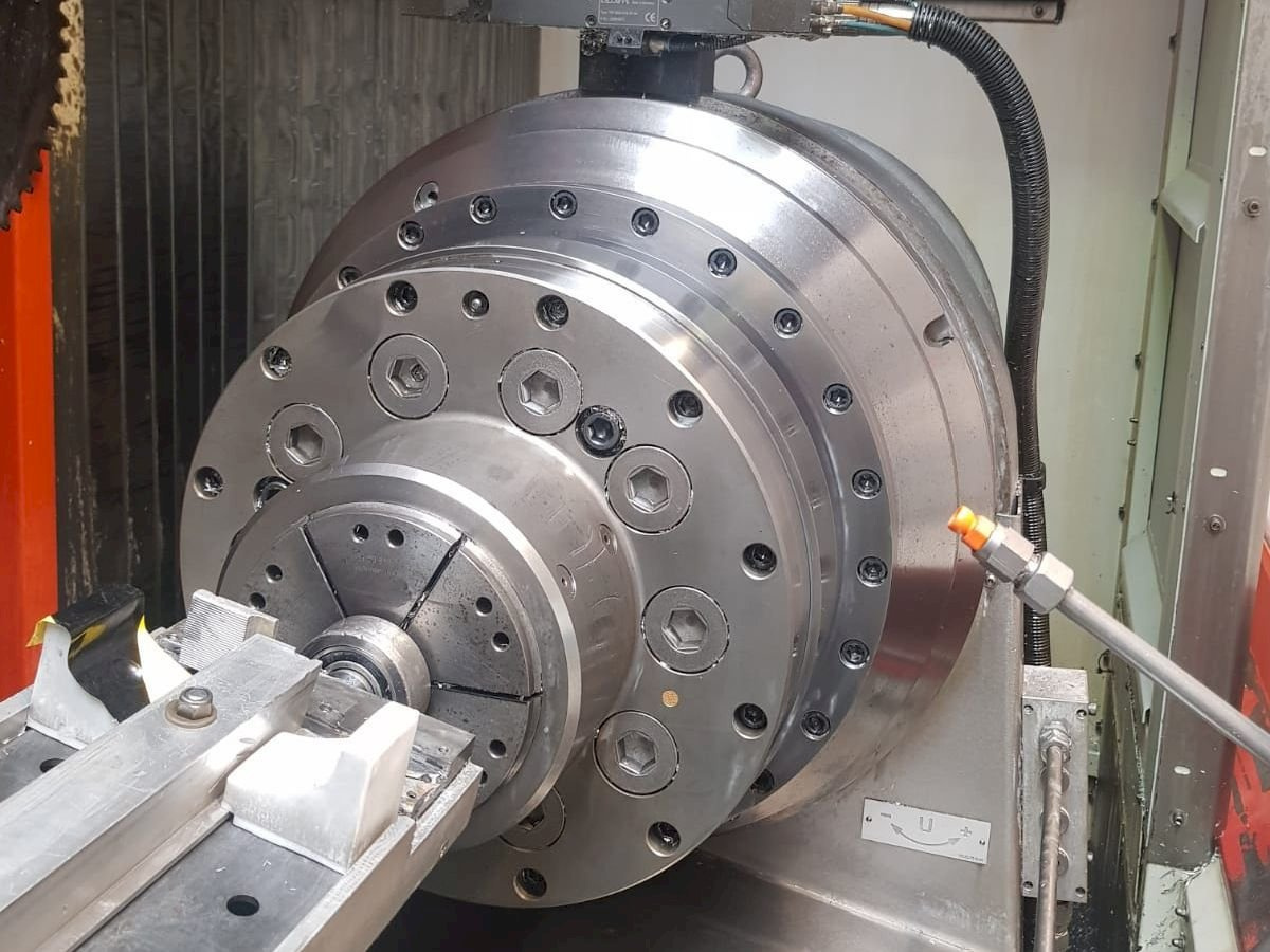 - 1 поворотный стол с ЧПУ с прямым приводом, возможность поворота и позиционирования, зажимная пластина Ø 630 мм с Т-образными пазами - Скорость макс. 80 об / мин Мощность: 40% постоянного тока 5 кВт, 100% постоянного тока 2,5 кВт Крутящий момент: 40% постоянного тока 600 Нм, 100% постоянного тока 270 Нм, транспортная нагрузка (в зависимости от скорости) макс. 1150 кг, вкл. система прямого измерения и привод оси Неподвижный поворотный стол (RT1) Сквозное отверстие 117 мм