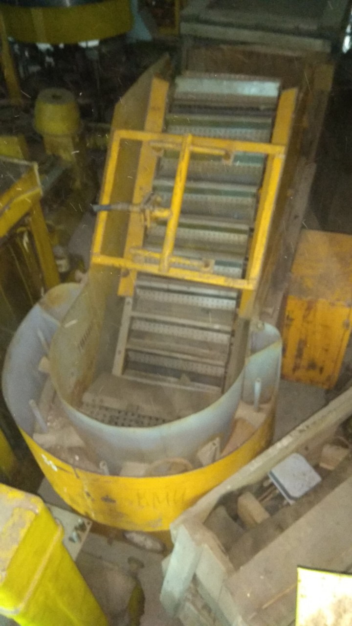Конвейер предназначен для транспортировки сырья из одной зоны в другую и выгрузки из машины. Роликовый конвейер включает в себя раму, валы приводной и направляющий, ролики и ковши. На выступающие из цепей концы осей установлены ролики и ковши, образующие конвейерное полотно. Ролики являются частью днища ковшей и при наезде на резиновые направляющие, расположенные на раме, начинают вращаться.