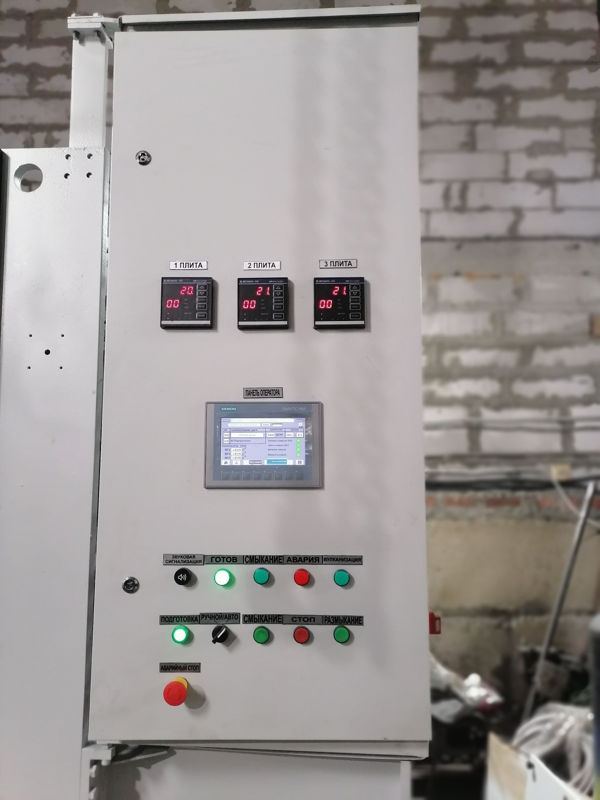 ООО ТЗВО г.Тамбов изготовит и поставит в адрес Заказчика прессы вулканизационные гидравлические 250х600, 250х800, 100х400 со шкафом управления с контроллером SIMENS». Шкаф имеет возможность записи работы пресса на флэш-карту, подсоединения к компьютеру по локальной сети, с сенсорной панелью для управления оператором и программным обеспечением.