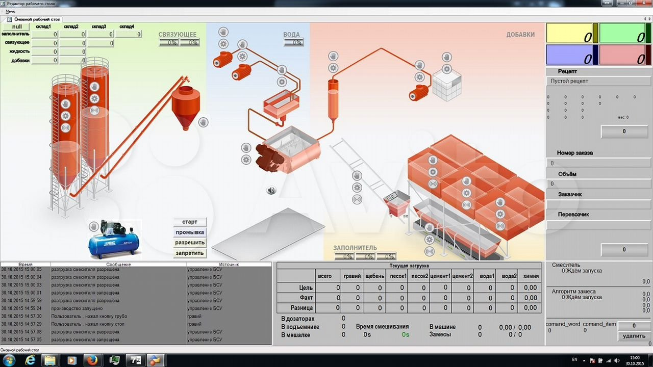 2.Автоматизированная система управления БРУ с возможностью производства бетона по заданной рецептуре и объему в автоматическом режиме, колличество возможных рецептов не ограниченно. Предусмотрен удаленный доступ для технической поддержки и контроля руководителем. Имеется возможность подключения различных прикладных программ, в том числе CRM-систем, программы 1С. Есть система ручного (кнопкой) и автоматического аварийного отключения установки. В состав системы автоматизации входит компьютер, принтер, силовой шкаф с контроллером Siemens, комплект датчиков.