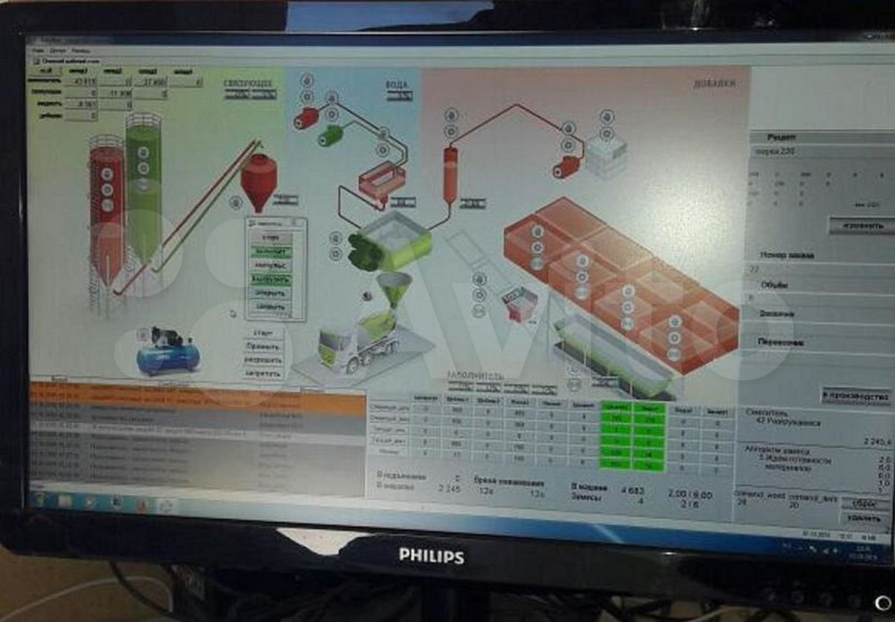 2.Автоматизированная система управления БРУ с возможностью производства бетона по заданной рецептуре и объему в автоматическом режиме, колличество возможных рецептов не ограниченно. Предусмотрен удаленный доступ для технической поддержки и контроля руководителем. Имеется возможность подключения различных прикладных программ, в том числе CRM-систем, программы 1С. Есть система ручного (кнопкой) и автоматического аварийного отключения установки. В состав системы автоматизации входит компьютер, принтер, силовой шкаф с контроллером Siemens, комплект датчиков.