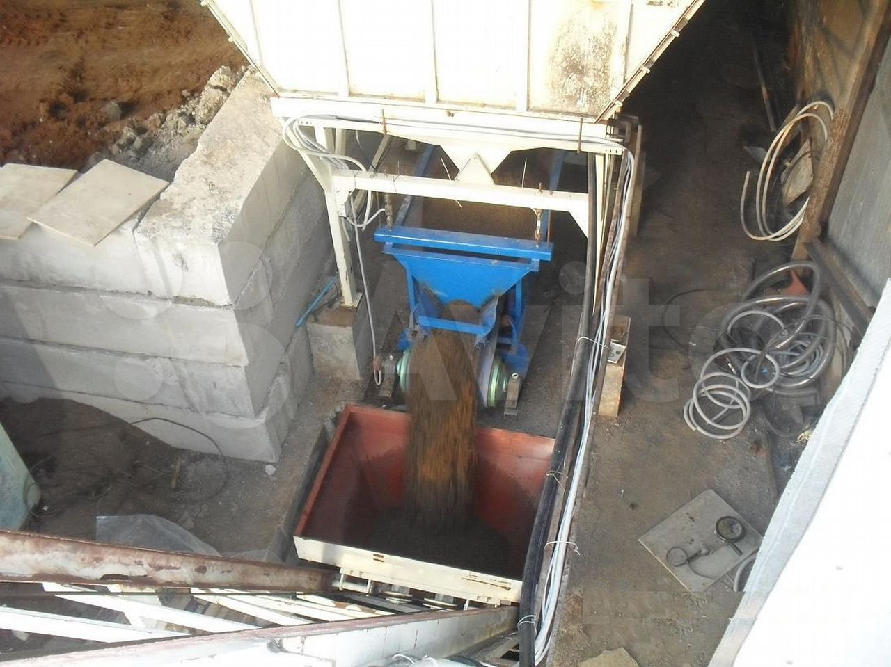 3. Скиповый подъемник для подачи инертных материалов в смеситель. Включает в себя подъемный ковш, двигатель мощностью 18,5 кВт, редуктор, лебедку, пневматический вибратор и направляющие.