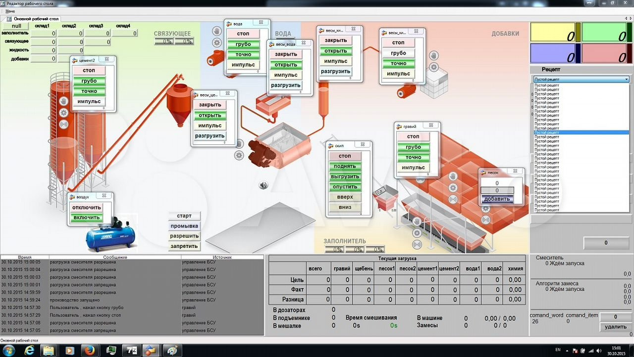 2.Автоматизированная система управления БРУ с возможностью производства бетона по заданной рецептуре и объему в автоматическом режиме, колличество возможных рецептов не ограниченно. Предусмотрен удаленный доступ для технической поддержки и контроля руководителем. Имеется возможность подключения различных прикладных программ, в том числе CRM-систем, программы 1С. Есть система ручного (кнопкой) и автоматического аварийного отключения установки. В состав системы автоматизации входит компьютер, принтер, силовой шкаф с контроллером Siemens, комплект датчиков.