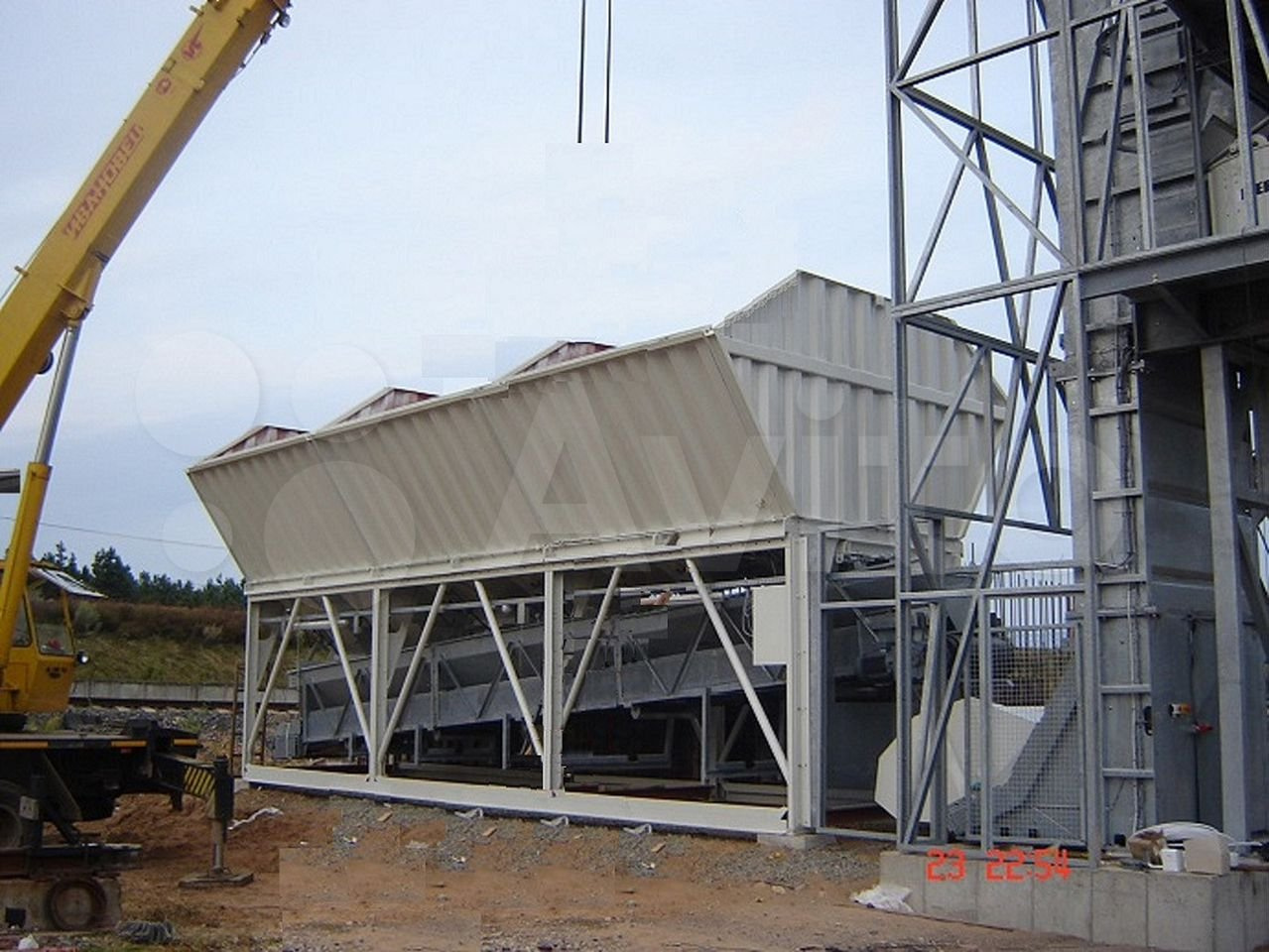 4. Система взвешивания и дозирования инертных материалов состоит из 3 бункеров для инертных материалов, объемом 20 м3 каждый, разборной рамы, конвейера для взвешивания и транспортировки инертных материалов (щирина ленты 1000 мм), пневматических цилиндров, пневматических вибраторов (2 шт).