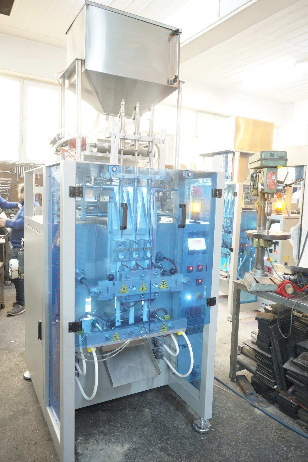 Стик машины оснащены цветным интефейсом, посредством которого машина легко управляется, контролируется скорость машины, центрируется бобина упаковочного материала, производится активация/дизактивация блока фотоэлементов и изменение длины пакета. Рабочая часть стик машин закрыта защитными дверцами на датчиках и предупреждающими знаками согласно правилам техники безопасности.