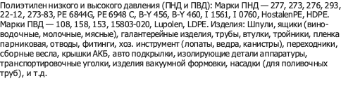 Полиэтилен низкого и высокого давления (ПНД и ПВД): Марки ПНД — 277, 273, 276, 293, 22-12, 273-83, PE 6844G, PE 6948 C, B-Y 456, B-Y 460, I 1561, I 0760, HostalenPE, HDPE. Марки ПВД — 108, 158, 153, 15803-020, Lupolen, LDPE. Изделия: Шпули, ящики (вино-водочные, молочные, мясные), галантерейные изделия, трубы, втулки, тройники, пленка парниковая, отводы, фитинги, хоз. инструмент (лопаты, ведра, канистры), переходники, сборные весла, крышки АКБ, авто подкрылки, изолирующие детали аппаратуры, транспортировочные уголки, изделия вакуумной формовки, насадки (для поливочных труб), и т.д.