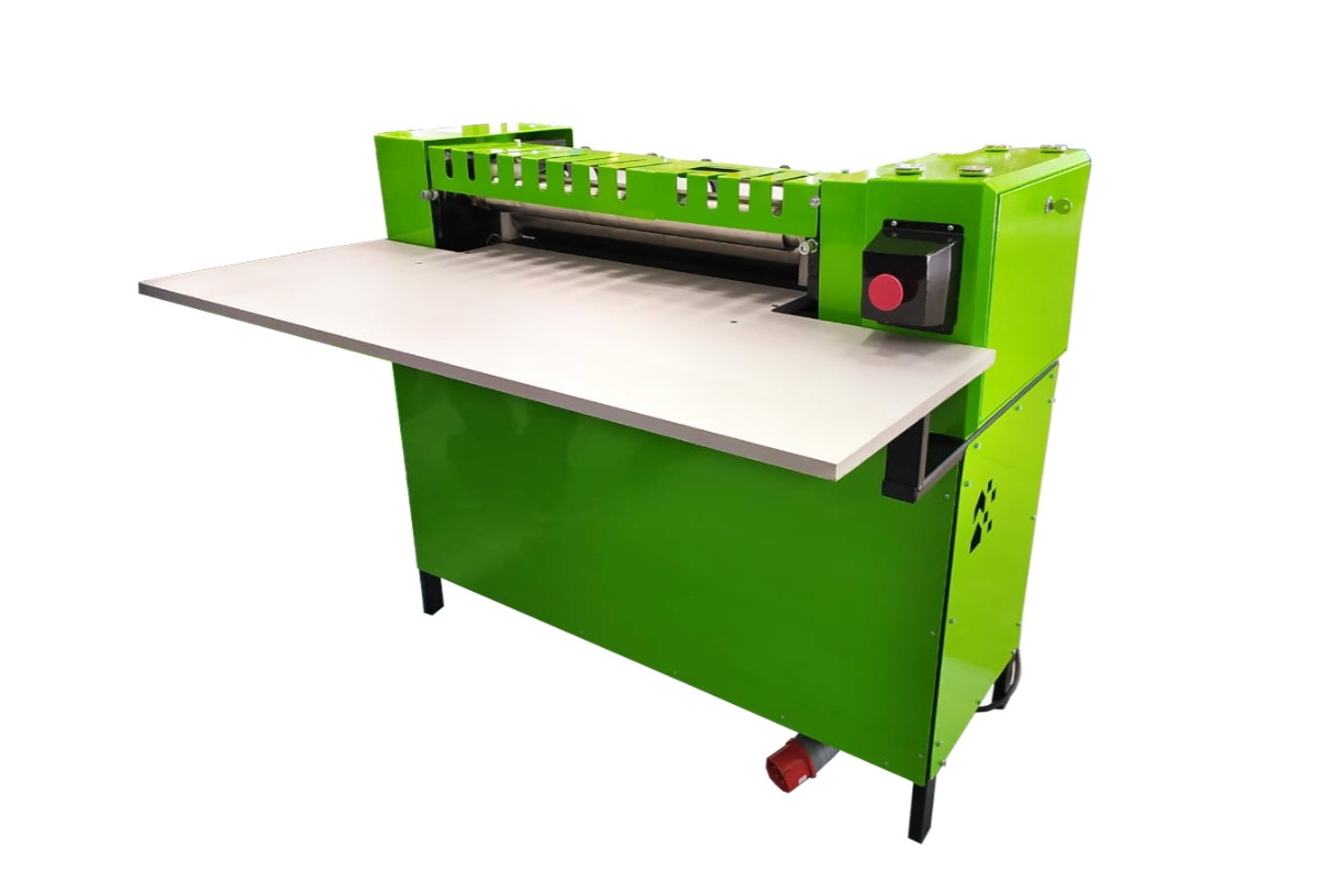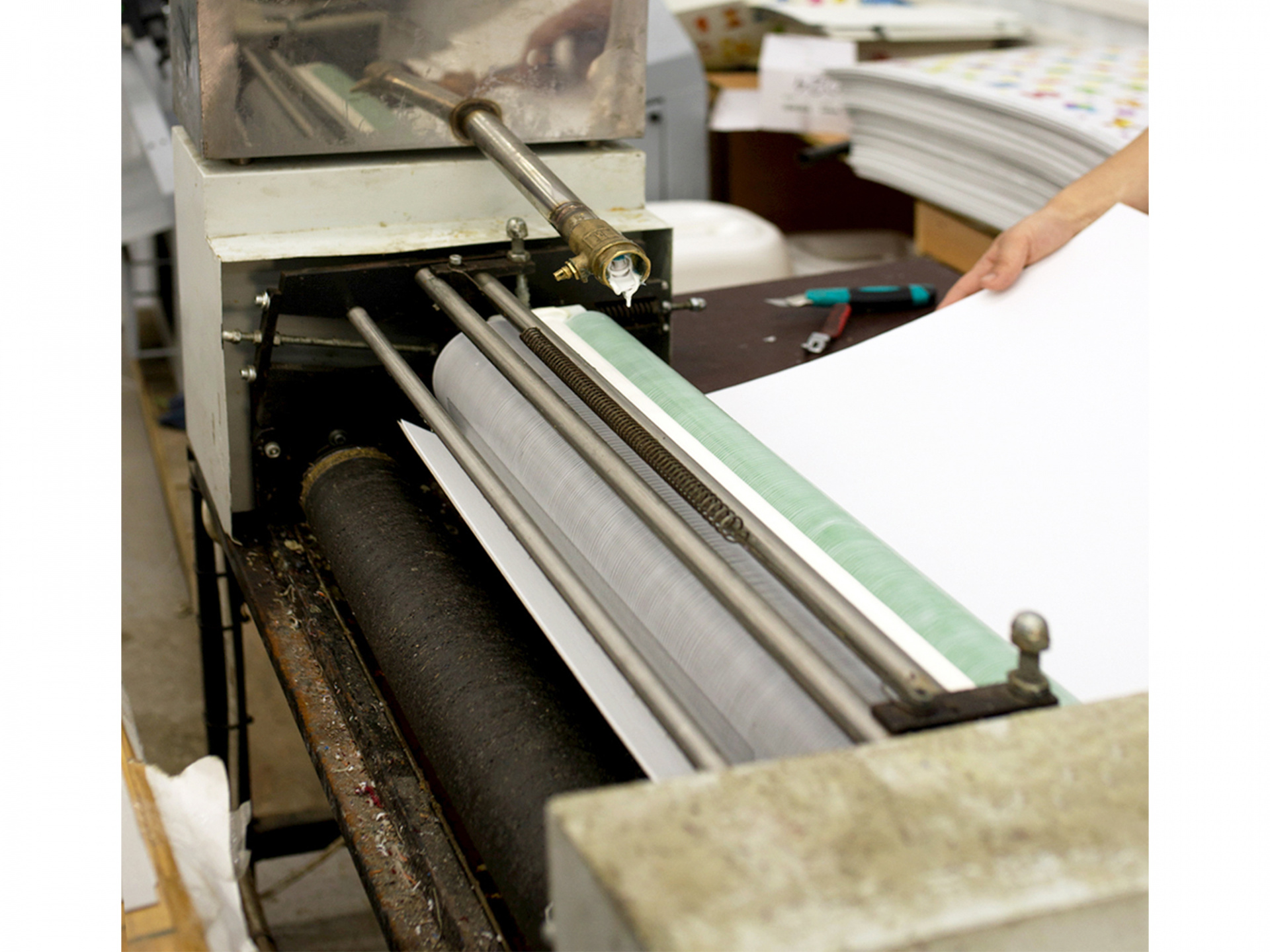- Оператор вручную подает листы в рабочую зону, холодный клей, на водной основе, подается из контейнера закрепленного сверху на валы.