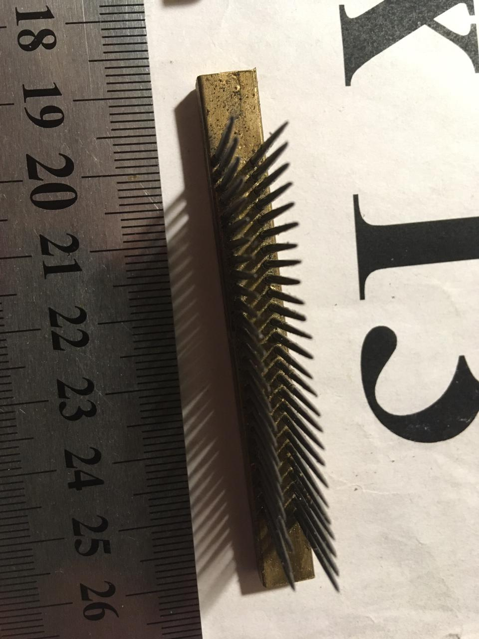 Продам Гребенки для Ткацких станков 3500 шт новые в упаковке, 3500 штук основание латунь, дл 70 мм ширина 7мм высота 5мм, стальные штыри два ряда по 26 шт, высота 20 мм расстояние между рядами штырей 5 мм, Децимальный номер 72852513525. Локация г. Владимир - 33 регион. Предложите свою цену тел 89585104715 Ильгар. Вайбер и Вотцап