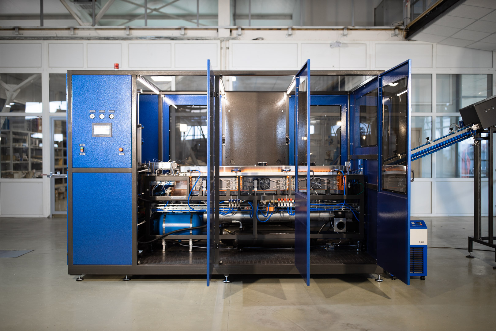 19 пневмоцилиндров: в системе смыкания выдувной формы, растяжки, система переноса разогретой преформы в выдувную форму, система выноса бутылки. Регулировка предвыдува по задержке, 8-ти зонная регулировка температуры в печи.