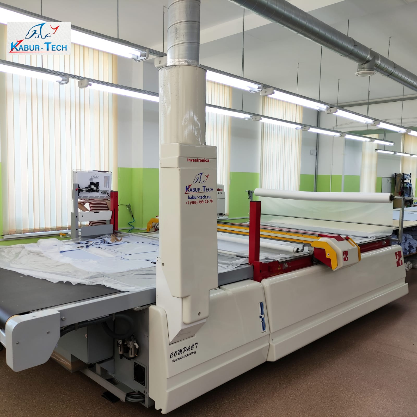 Автоматический раскройный комплекс для многослойного раскроя текстильных материалов INVESTRONICA. Возможность раскраивать материалы в сжатом виде до 70 мм толщиной настила, в зависимости от модели оборудования.