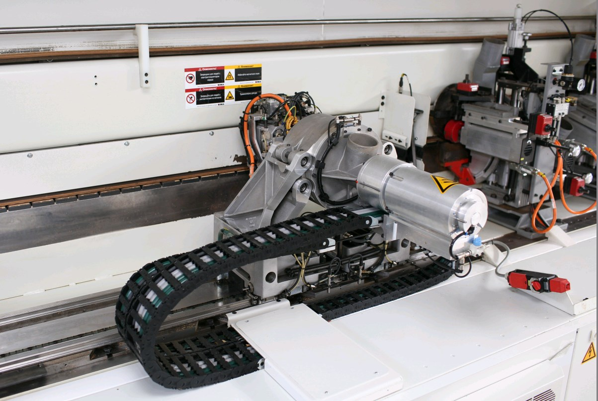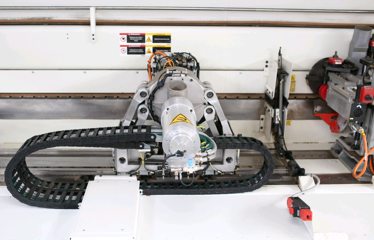 Обрабатывающая головка состоит из двигателя, подготовленного для крепления многопрофильного инструмента, бокового копира и устройства для точного копирования контура, перемещается параллельно контуру детали по 2 линейным осям с прямым приводом и поворотной оси с прямым приводом. Программная переналадка агрегата для обработки до 4 различных профилей, в т.ч. точное позиционирование в зависимости от толщины кромки. Поставляется с редактором контуров, 5 программами обработки, программой управления параметрами инструментов и агрегата, а также со статическим преобразователем частоты с функцией автоматического торможения.