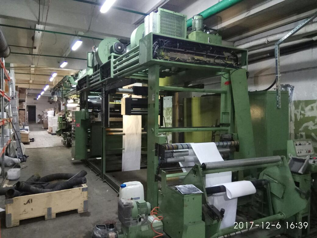 Машина работает в типографии, легка в эксплуатации, используется для нанесения 4-х цветной печати на материал шириной до 1200мм. Отдельная "лаковая" секция. Внутренний тельфер для загрузки валов и роликов с материалом. Производительность до 120 метров в минуту. Пять комплектов печатных валов, диаметр цилиндров: 121;137;153;196;222. На печатной машине установлены две ракельные секции для получения более качественной растровой печати. Анилоксовые валы 120,180. Комплект запасных резиновых валов. Габариты: длинна 12м. ,ширина 2,8м. ,высота 3,4м.