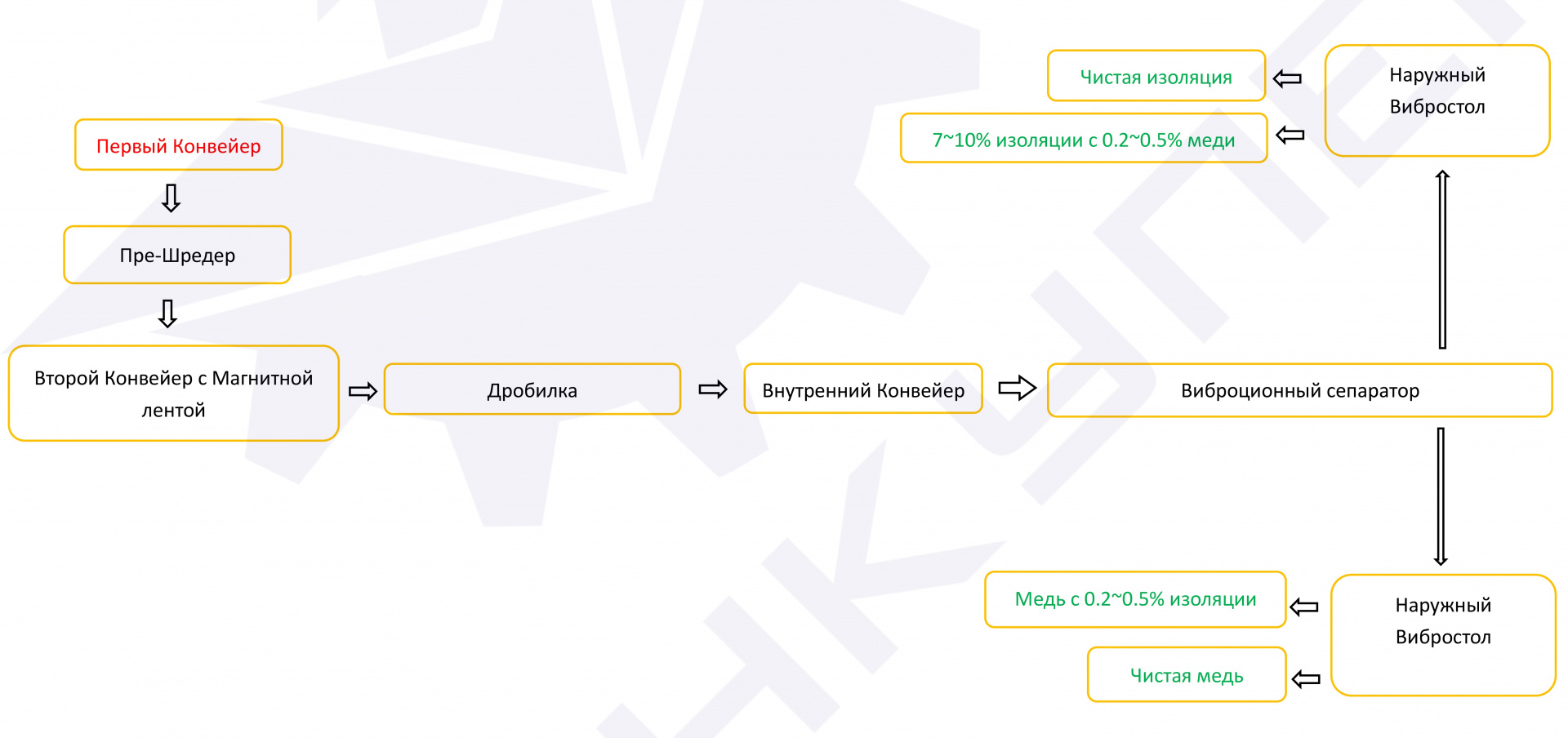 - Измельченный материал попадает на сепаратор. За счет воздушно-вибрационной сепарации изоляция отделяется от металлической сечки.