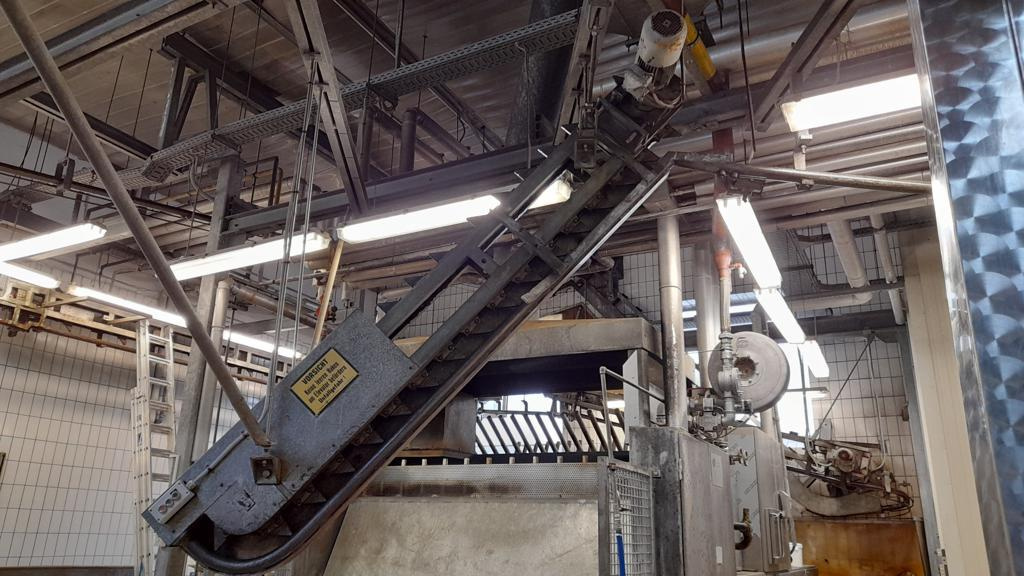 Современная промышленная линия для убоя свиней с горизонтальным конвейером.
