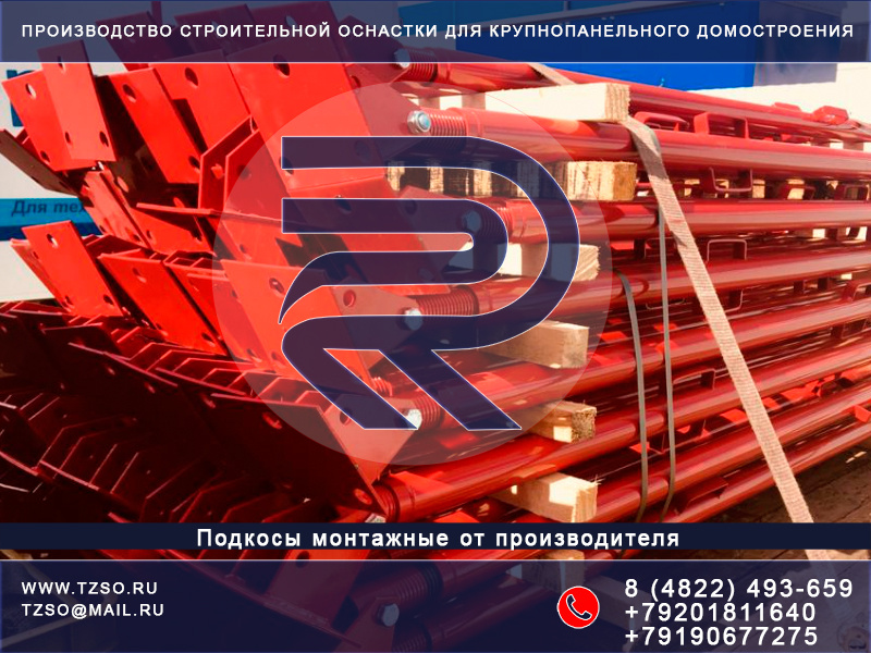 Монтажный подкос или крюк-крюк– это жесткая конструкция без собственных свойств устойчивости. Действует на линейное сжатие и используется для фиксирования элементов в установленной позиции. Это универсальное и распространенное приспособления для крепления невысоких колонн, элементов перегородки, панелей и прочих сборочных компонентов до финального проектного монтажа.Также применяется в каркасно-монолитных постройках.Несущие элементы производятся в соответствии с нормативами ГОСТ для соблюдения коэффициента стойкости.
