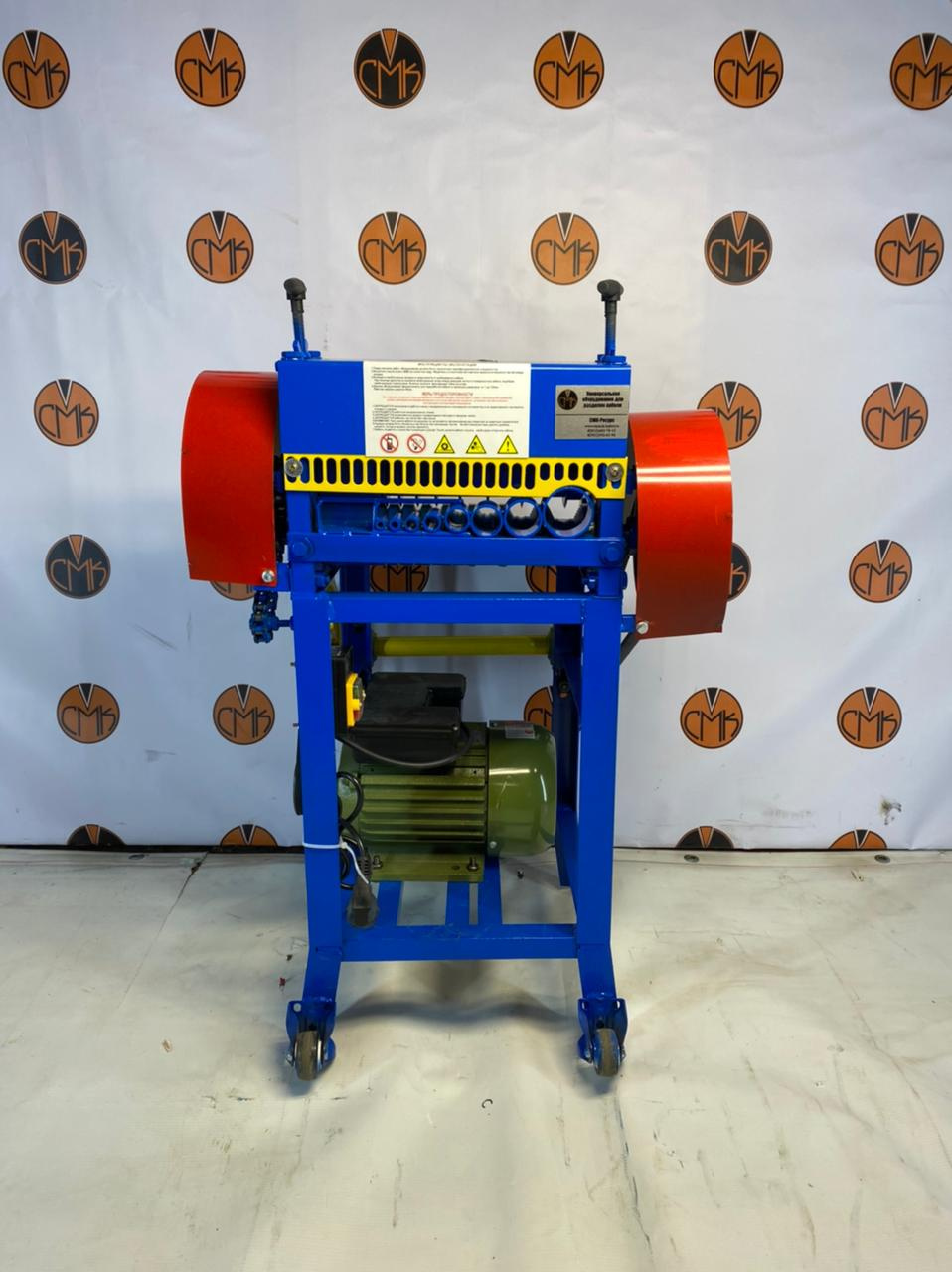 Станок предназначен для разборки кабеля от 1 до 35мм. Четыре вала в конструкции этого станка позволяют разбирать кабель одновременно с двух сторон и на выходе вы получаете чистый материал. Прижим валов осуществляется поворотом рукояток расположенных на верхней части станка. На станке 11 отверстий для подачи кабеля и 15 круглых ножей. Наличие колёс позволяют при необходимости оперативно перемещать станок одному оператору. Небольшой вес, мощность и функциональность является отличительной чертой этой машины.